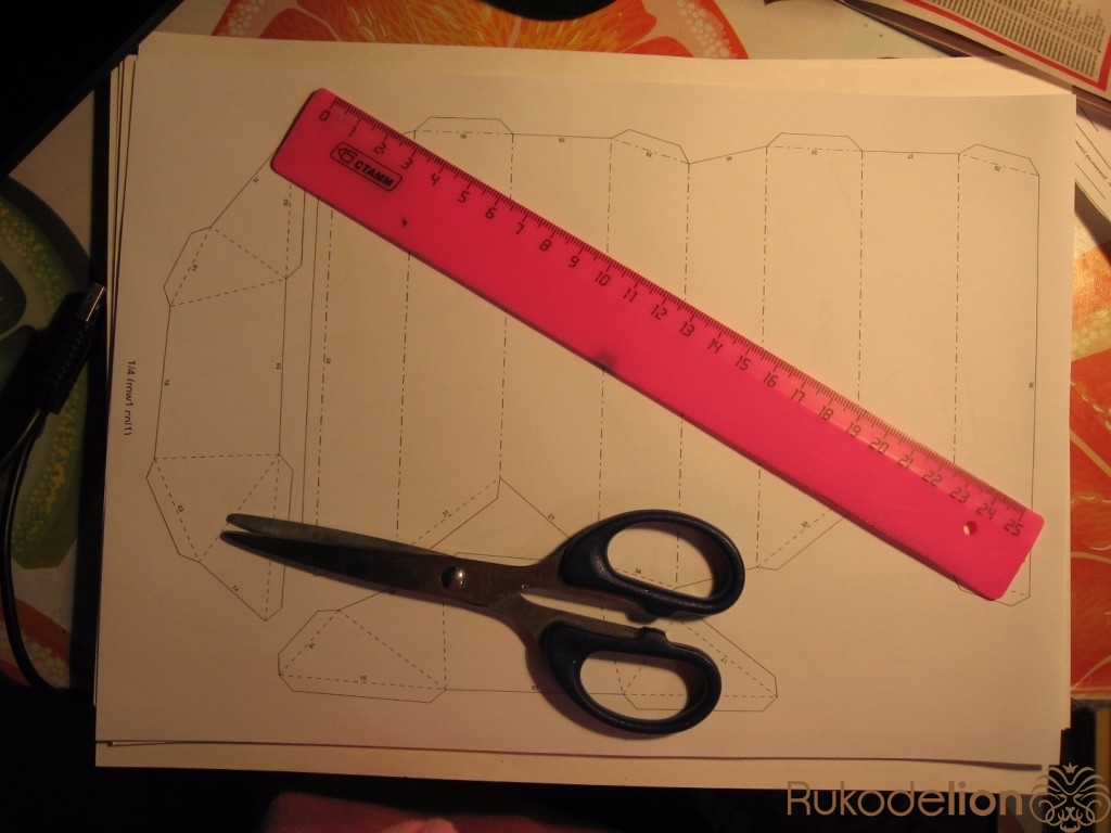 Материалы и инструменты: бумага (плотность 200гр), ножницы, клей момент-кристалл, акриловые краски, алкидная эмаль (золото), кусочки гофрокартона, линейка.