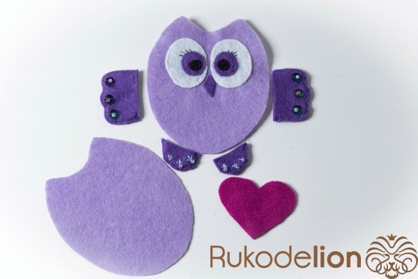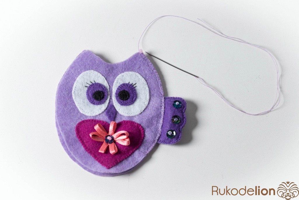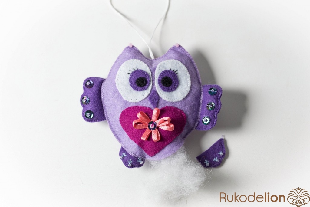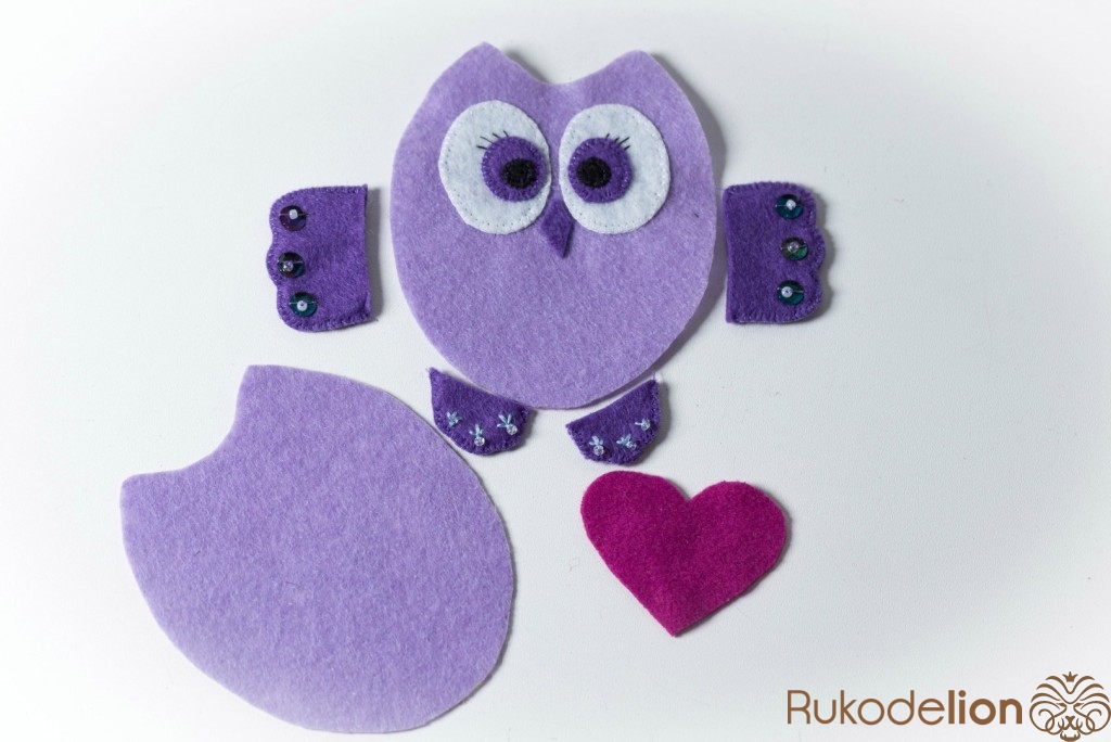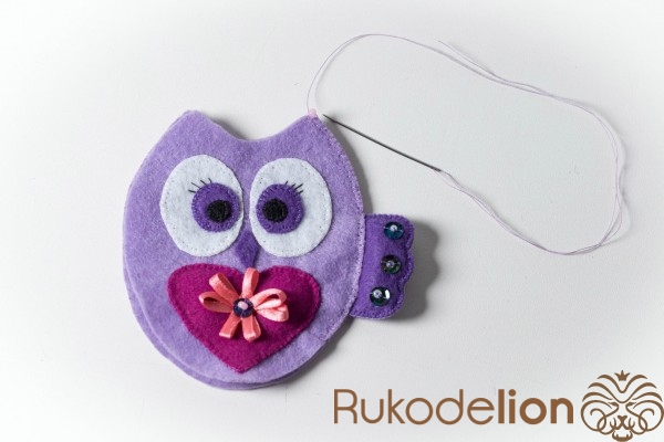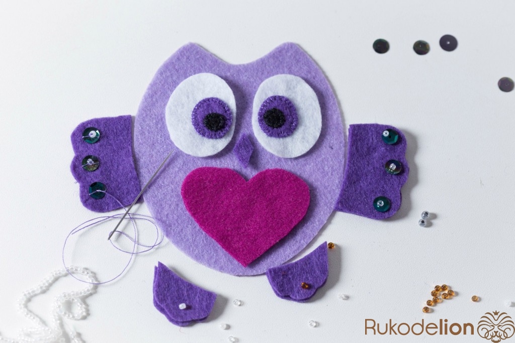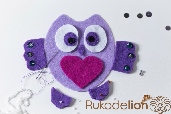 Теперь украшаем крылышки и лапки. Крылышки я украсили пайетками с бусинками, пришив их по краю каждого крыла. На лапках у совы вышила стебельчатым швом нитками мулине мини цветочки с бусинками.