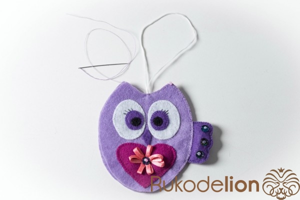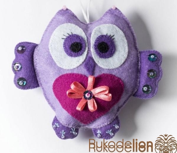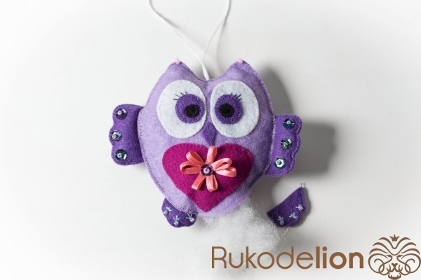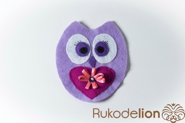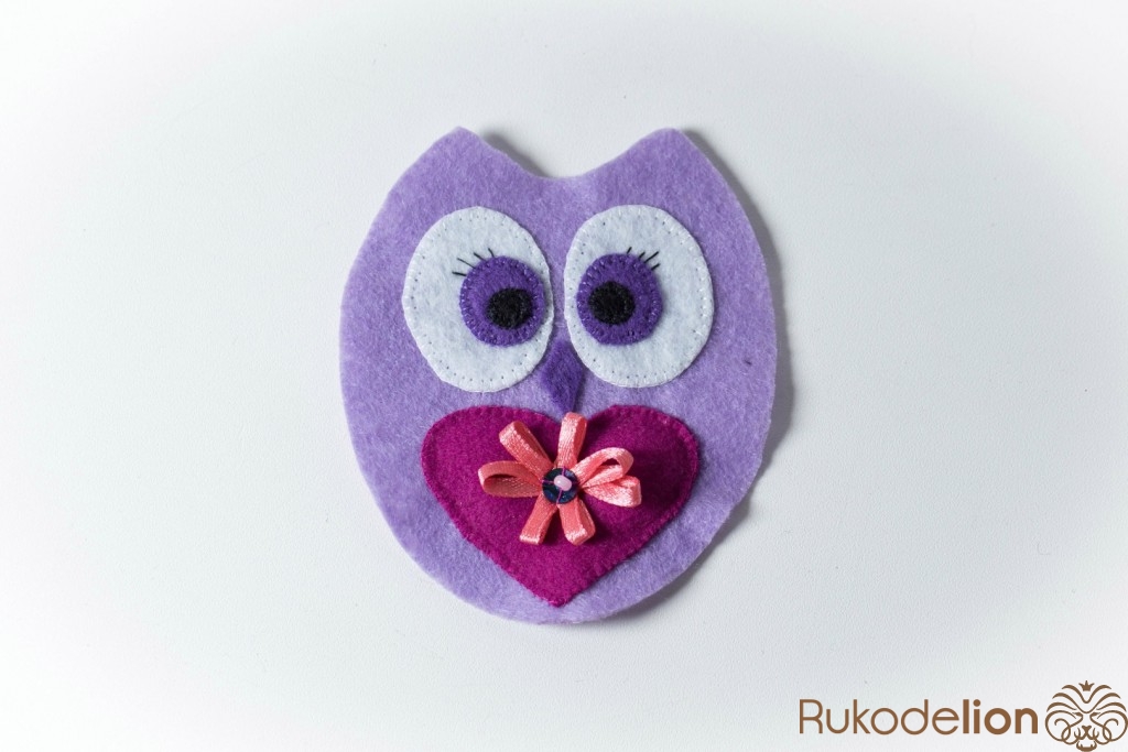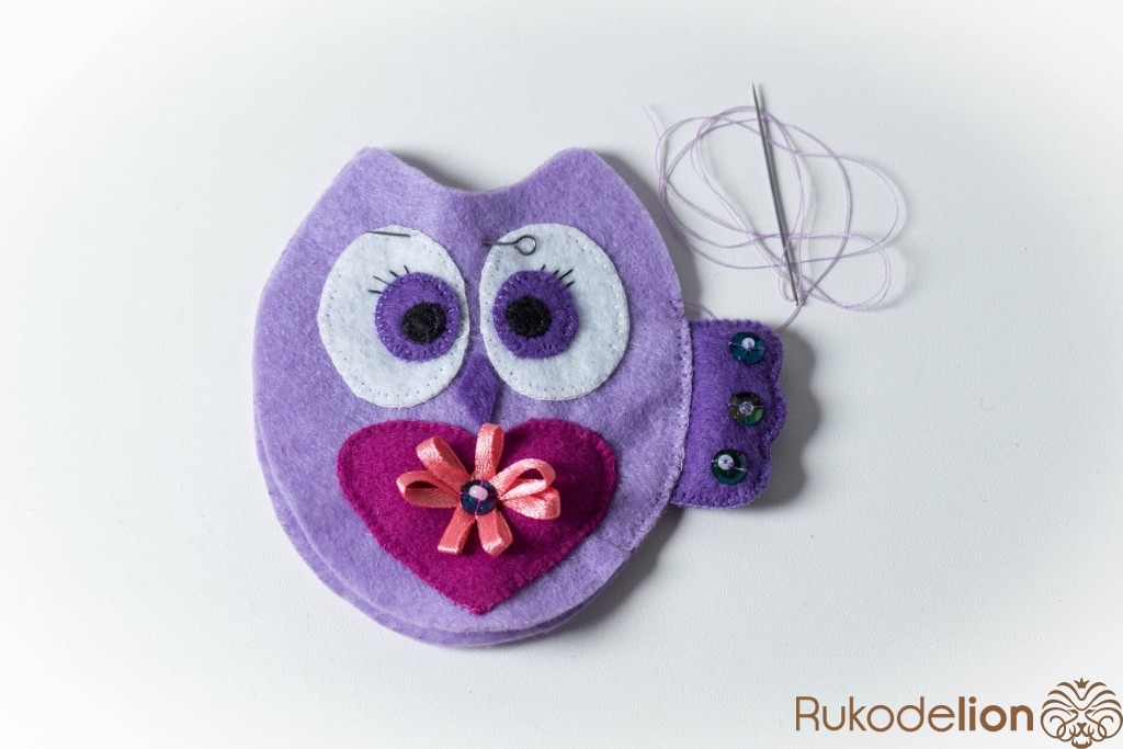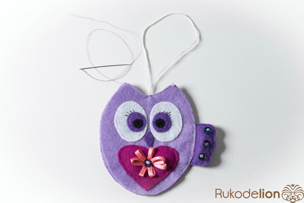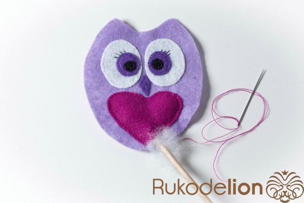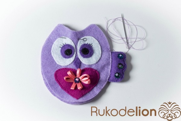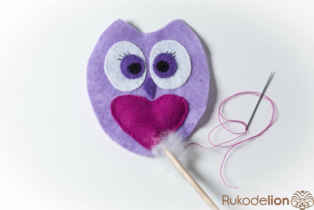 Сшиваем глазки поочередно петельным швом для вышивки. Сначала черный зрачок, потом радужную оболочку, и сам глазик пришиваем к телу совушки. Швом "назад иголку" черными нитками мулине вышиваем реснички. Приклеиваем клювик.
