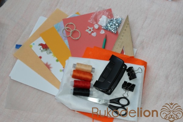 Теперь собираем обложку,верхняя сторона,между ними папка, нижняя часть и прошиваем на машинке. Приклеиваем стразы, цветочек,сердечки и звездочку. Собираем блокнот.