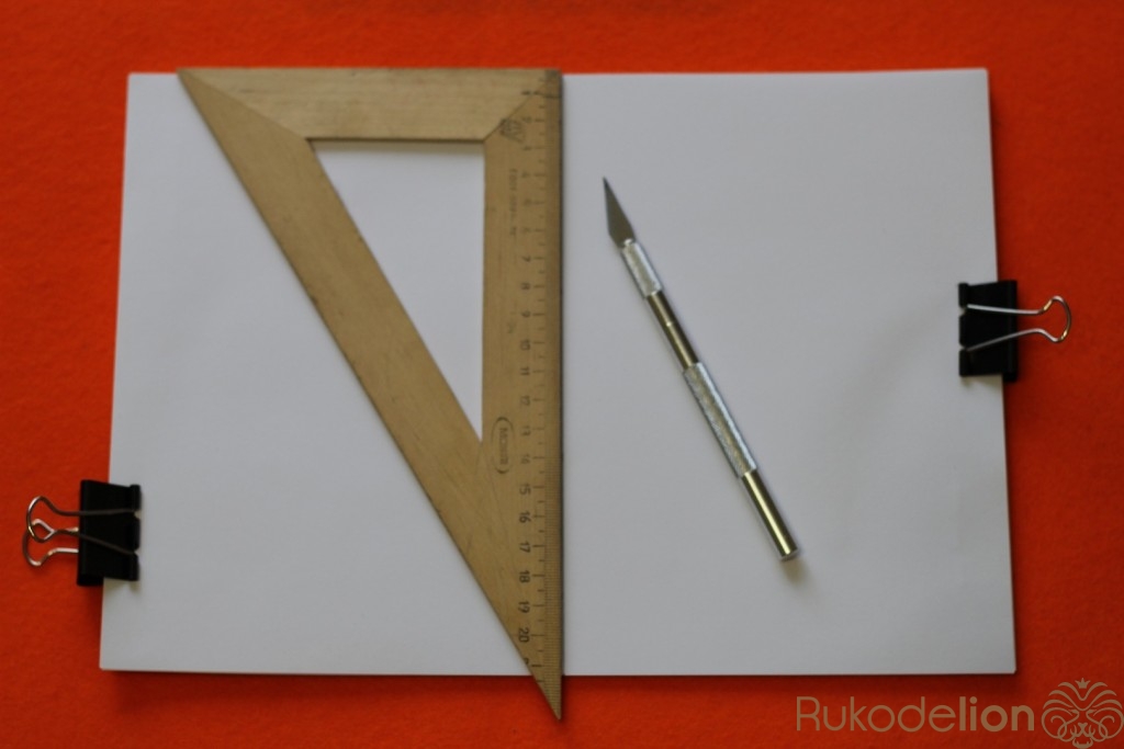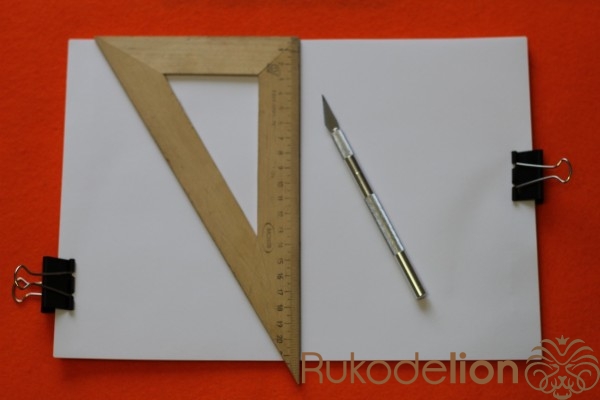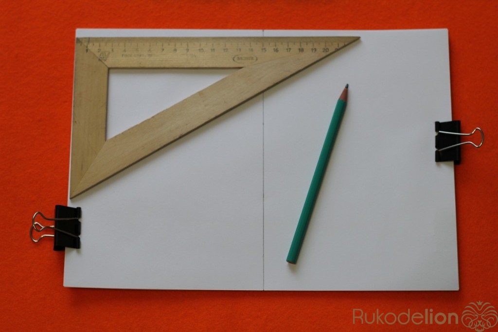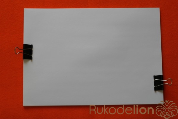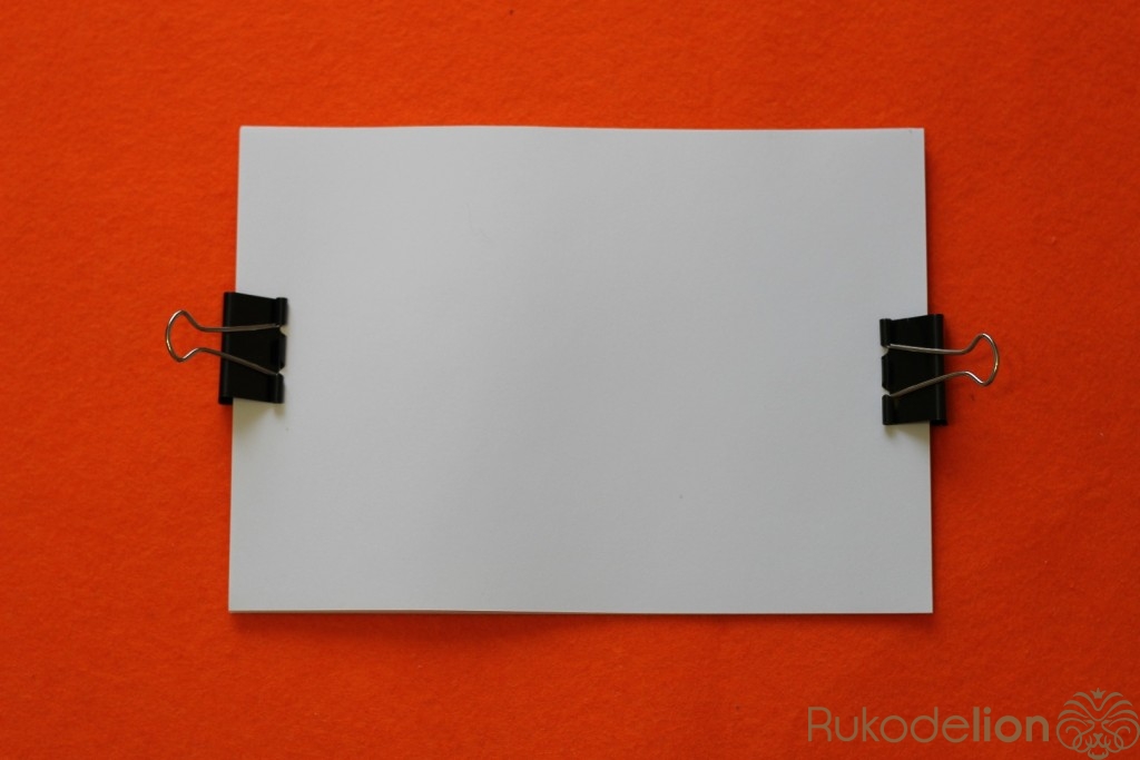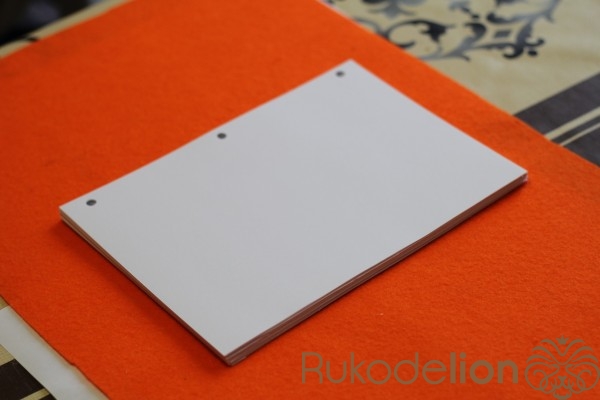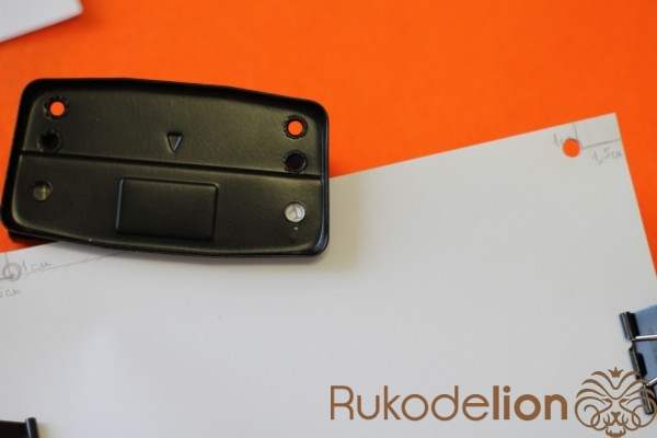 Что бы отверстия были ровные на всех листах,берем лист с отверстием и прикладываем к следующей части листов ,предварительно закрепленной зажимом.Обводим отверстия и пробиваем дыроколом. Так нужно сделать со всеми листами.