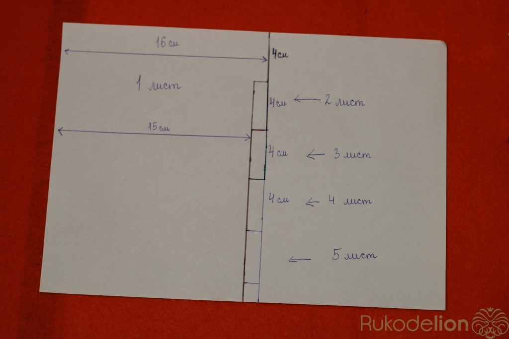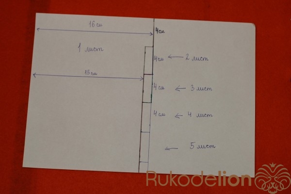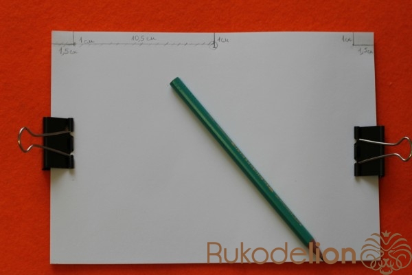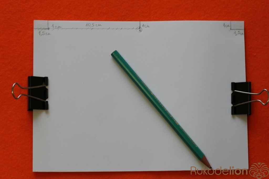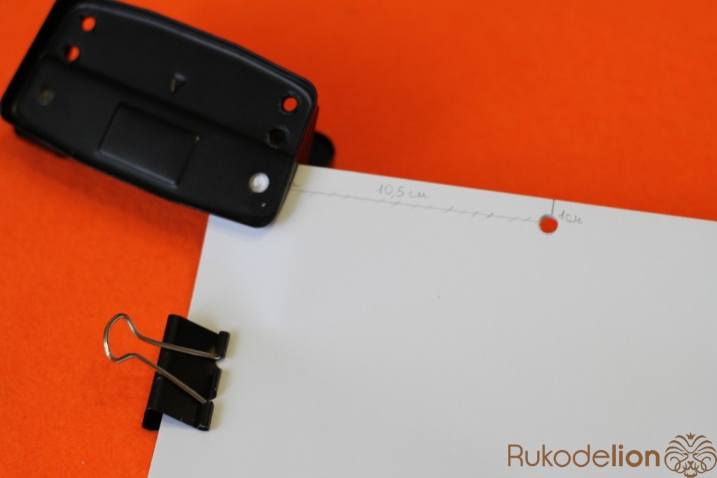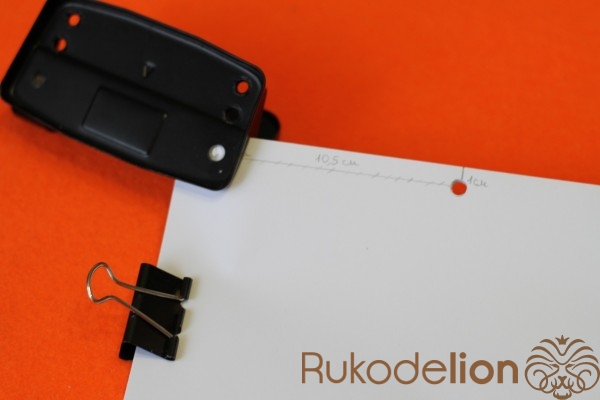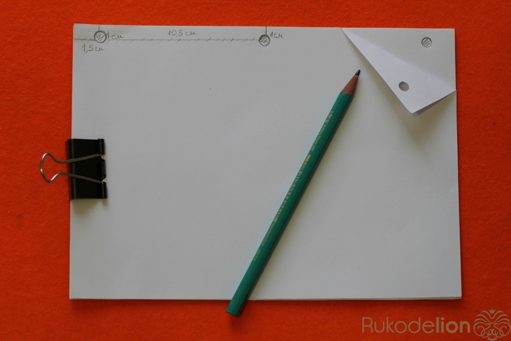 Теперь нам нужно сделать отверстия для колец.Берем часть листов,зажимаем их и от края листа отмеряем 1 см. Сверху и снизу отмеряем 1.5 см, и от нижнего края листа отмеряем 10.5 см (как показано на фото). В этих местах рисуем кружочки и с помощью дырокола делает отверстия.