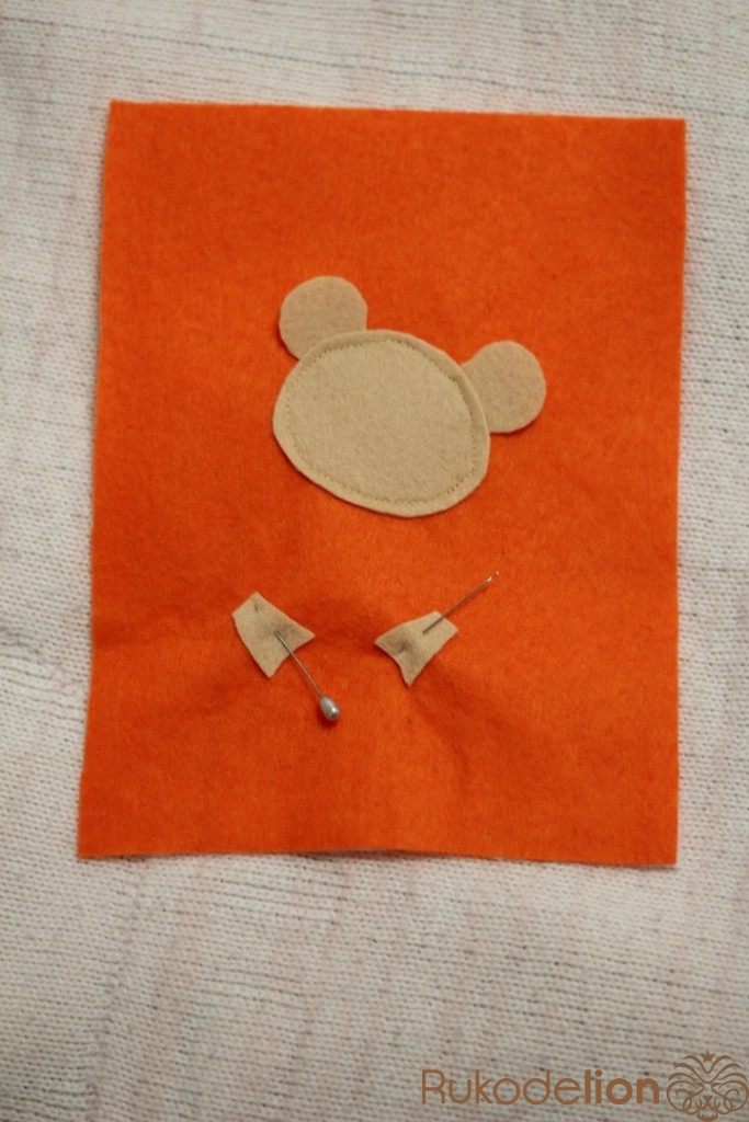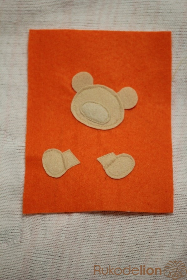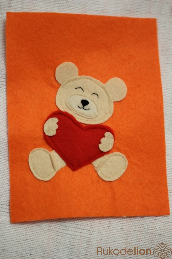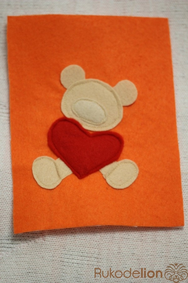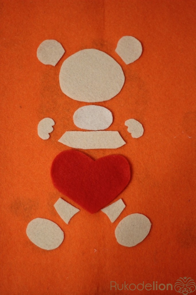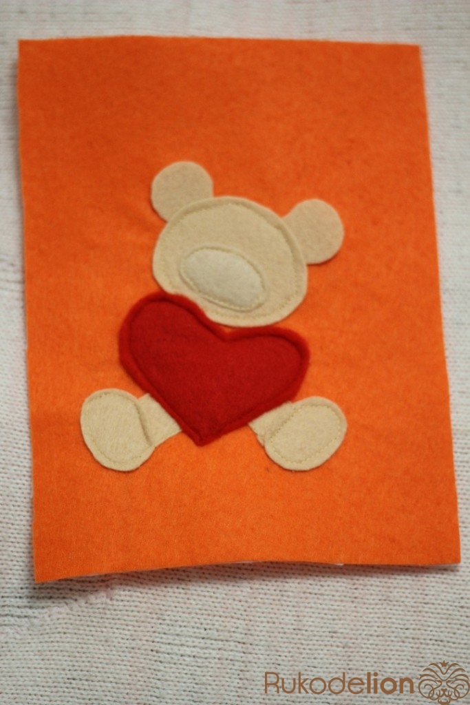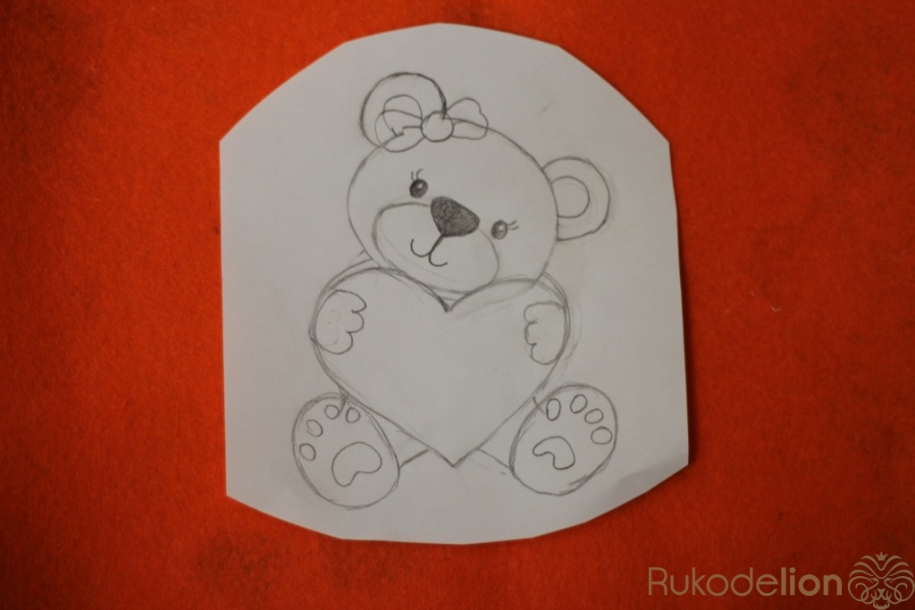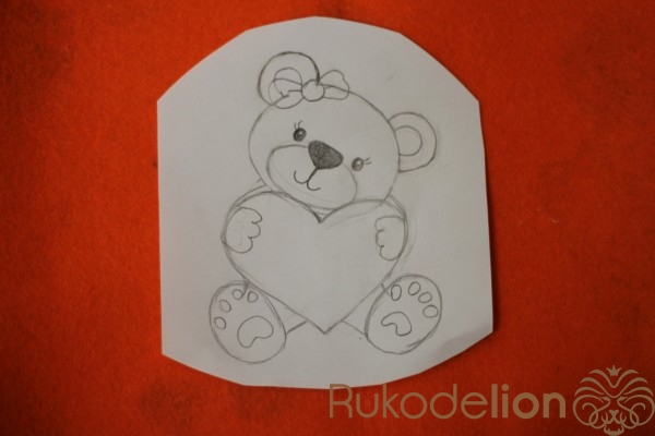 Рисуем выкройку мишки с сердцем,вырезаем и переносим на фетр. После того как детали мишки вырезаны нужно их пришить. С помощью машинки сначала пришиваем голову,подложив под нее уши.После пришиваем ноги,далее сердце,на него пришиваем лапки.Теперь пришиваем нос и вышиваем рот и глазки.