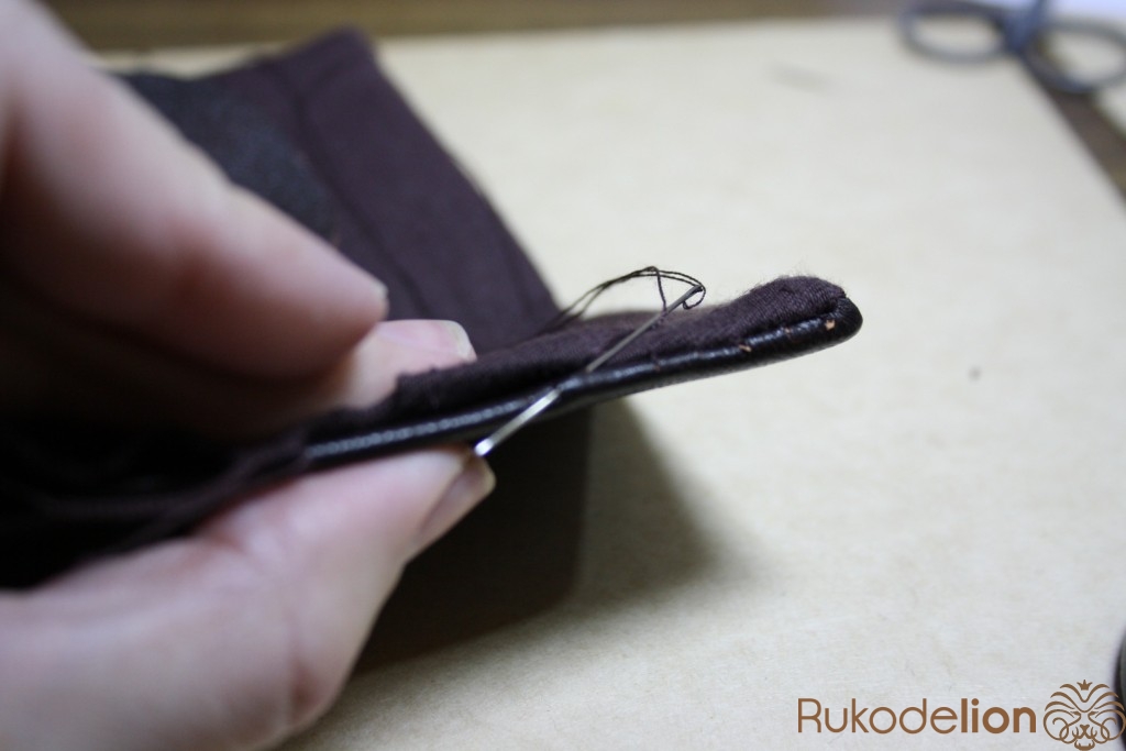 Вставляем внутрь одну деталь из картона. Делаем закрепительный шов и на расстоянии около 7 мм. от него делаем второй шов.