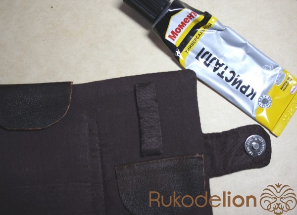 Прикладываем к основной внутренней части застёжку и верхний клапан слева (советую их немного приклеить, чтобы они держались на своих местах при дальнейшей работе).