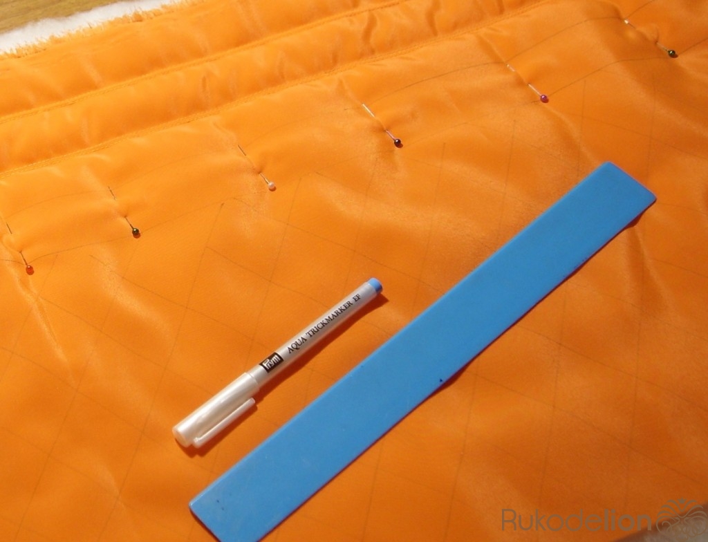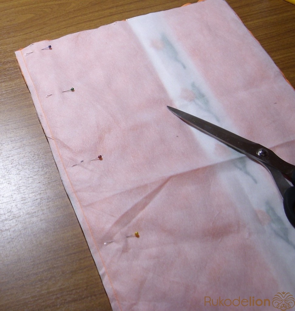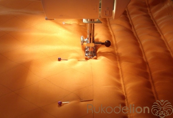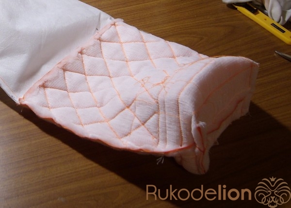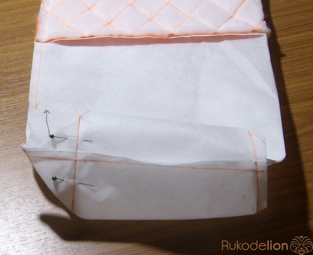 Затем складываем состроченные верх и подкладку боковыми швами. Стачиваем боковые щвы, оставив незастроченным отверстие 10-12 см в подкладке для выворачивания изделия на лицевую сторону.