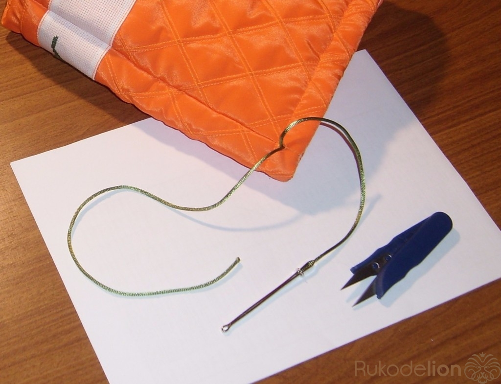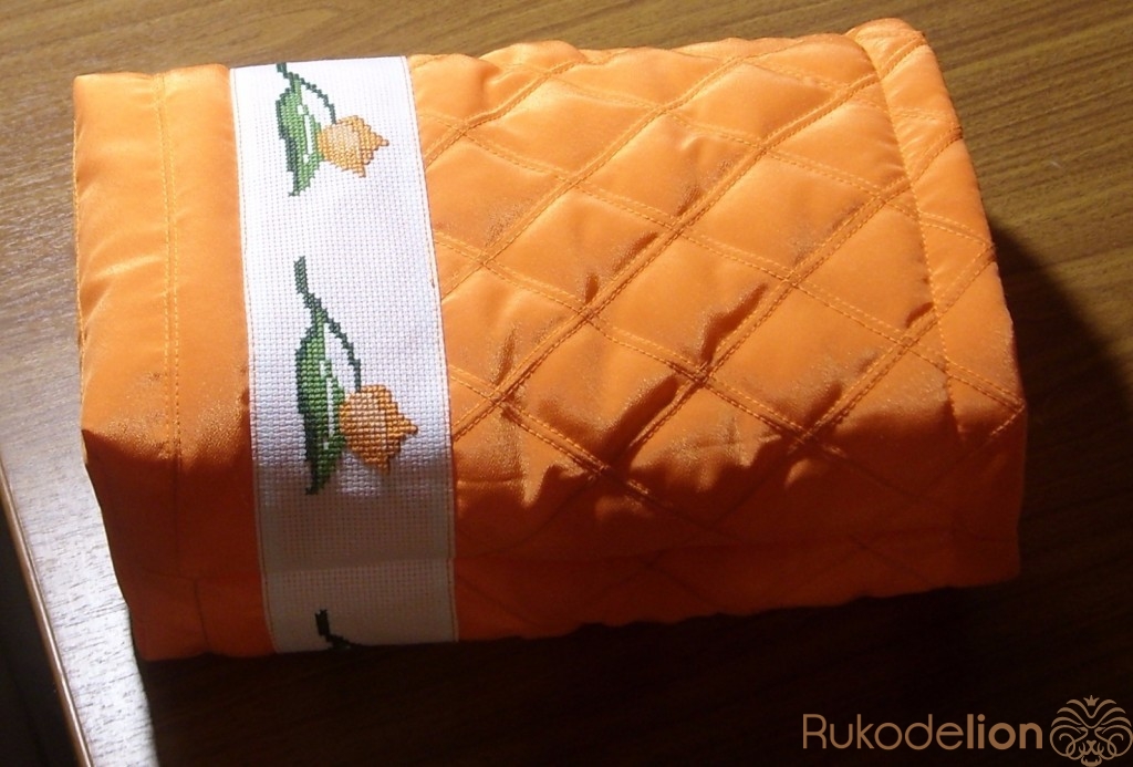Приметаем и пристрочим тесьму в край. Здесь использована ручная вышивка по канве.