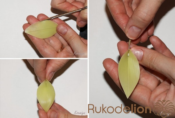 Раскатываем глину на ладони, формируя лист ландыша.