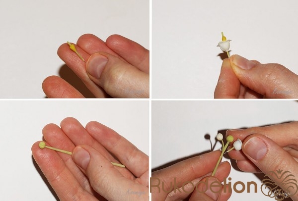 Продеваем в цветок стебель с тычинкой и отправляем сушиться.Отрезаем проволоку 7-8 см для основного стебля ландыша. Обкатываем зеленой глиной. На кончике формируем бутончик из зеленой глины.