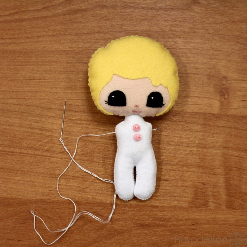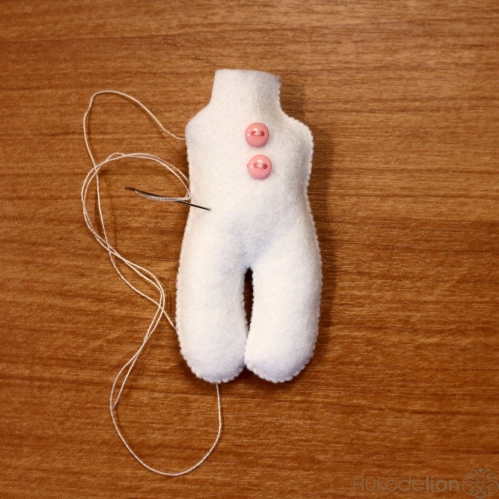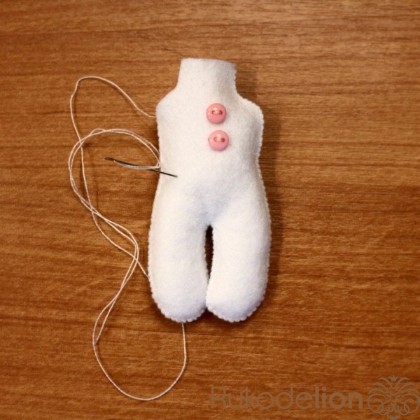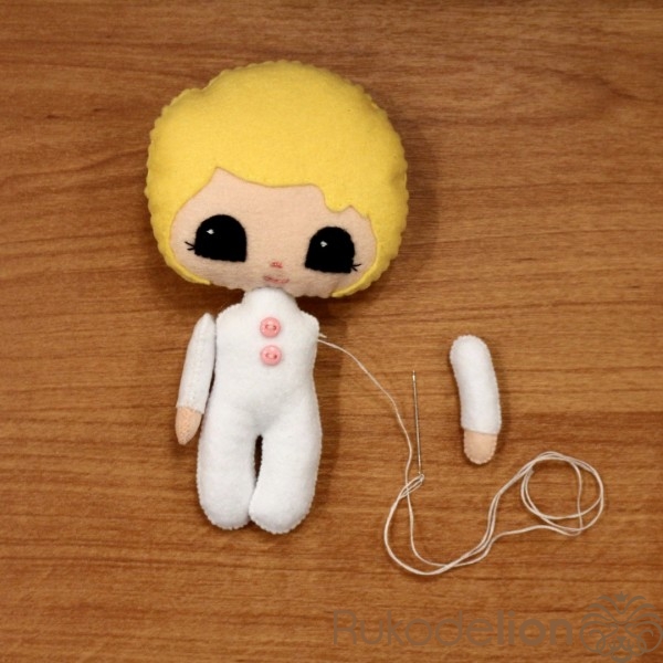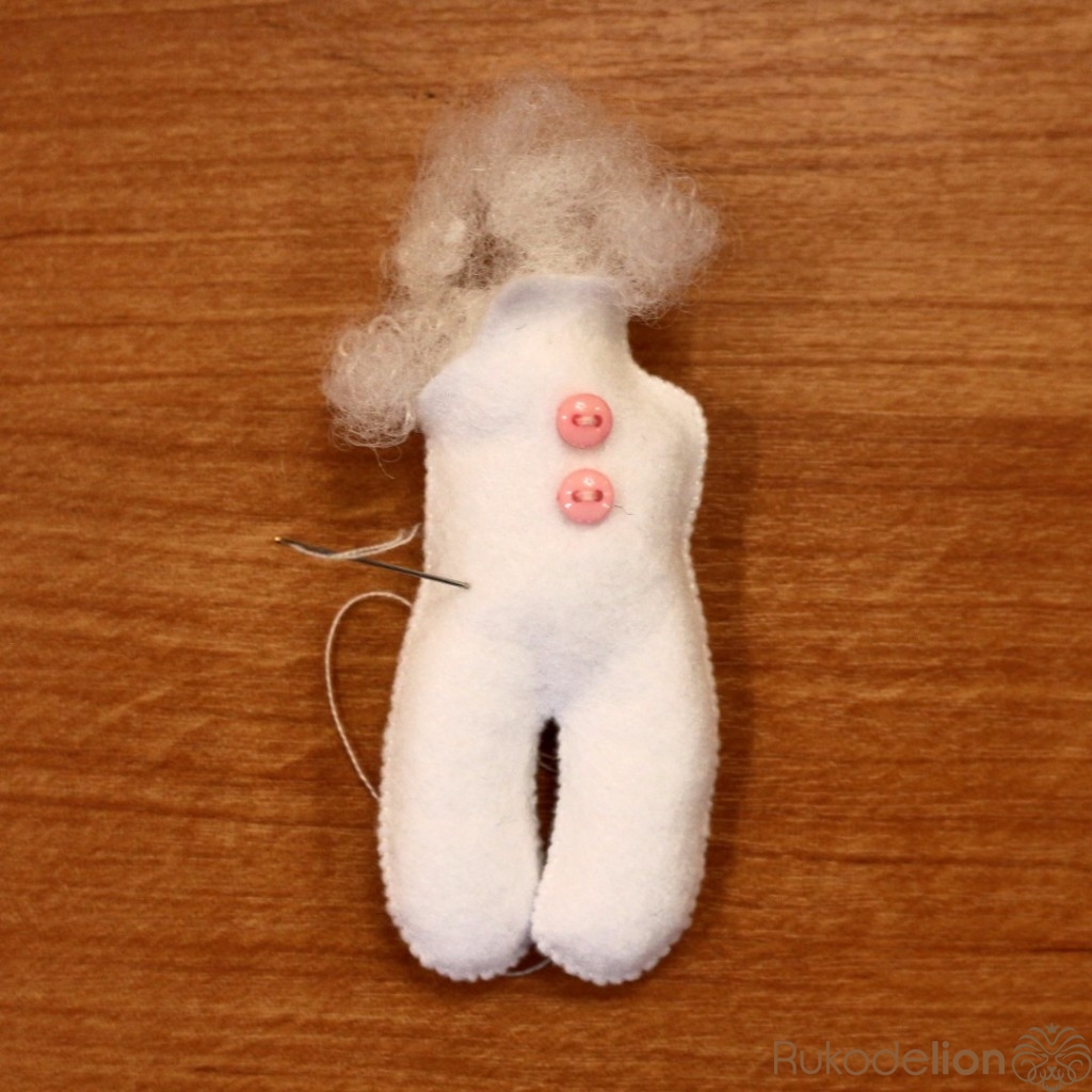 Теперь нужно прикрепить ручки к куколке. Для этого вводим иглу с одной из сторон чуть ниже плеча и протягиваем нить на противоположную сторону. Берем одну ручку и нанизываем ее на иголку и выводим иглу с внутренней стороны руки. Потом снова вводим иглу в туловище и выводим на другой стороне (где начинали) и аналогично крепим вторую ручку. Чтобы руки крепче держались, проделать этот шаг еще раз. Теперь руки закреплены.