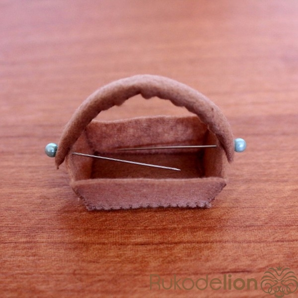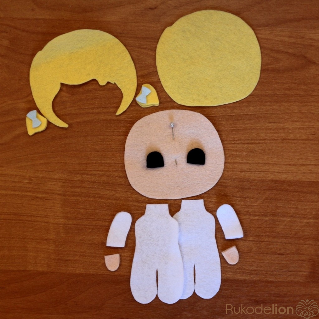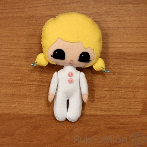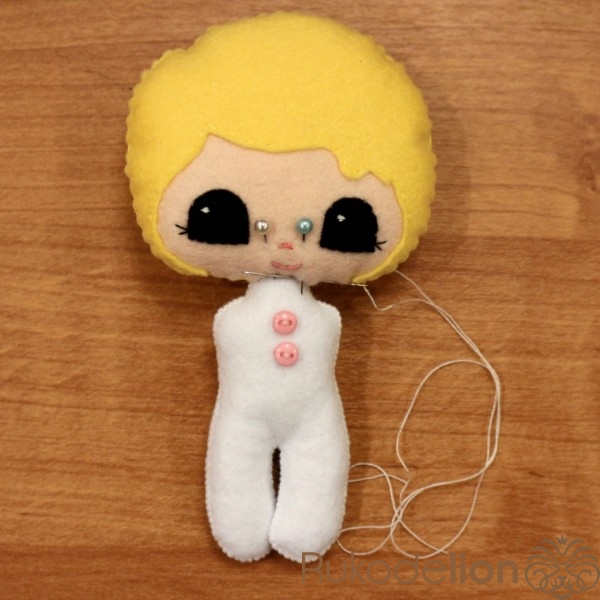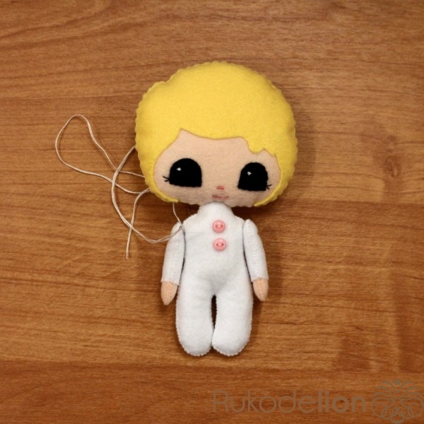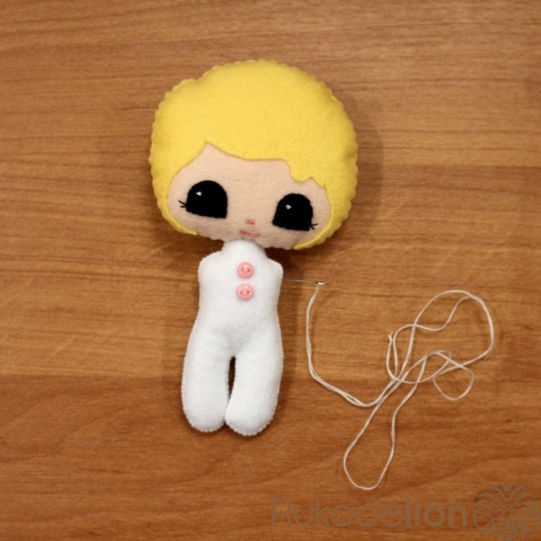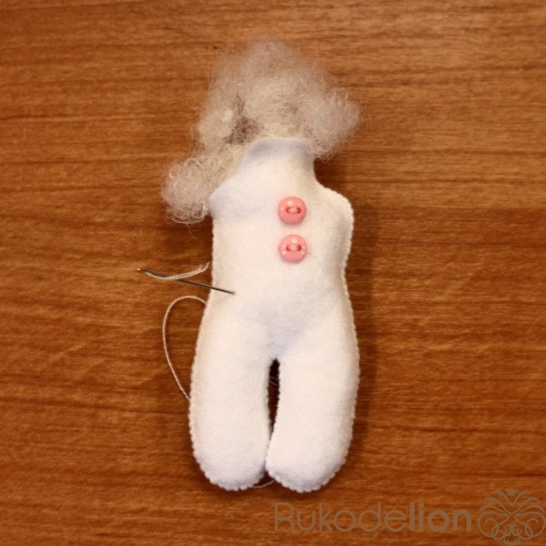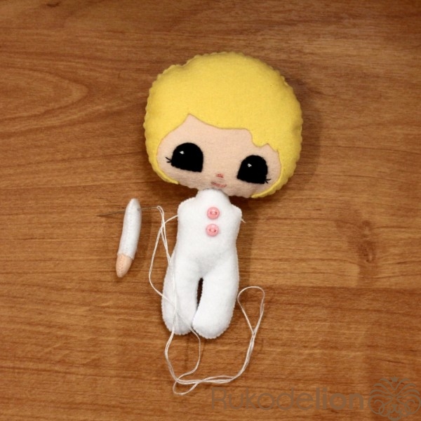 Теперь нужно прикрепить ручки к куколке. Для этого вводим иглу с одной из сторон чуть ниже плеча и протягиваем нить на противоположную сторону. Берем одну ручку и нанизываем ее на иголку и выводим иглу с внутренней стороны руки. Потом снова вводим иглу в туловище и выводим на другой стороне (где начинали) и аналогично крепим вторую ручку. Чтобы руки крепче держались, проделать этот шаг еще раз. Теперь руки закреплены.