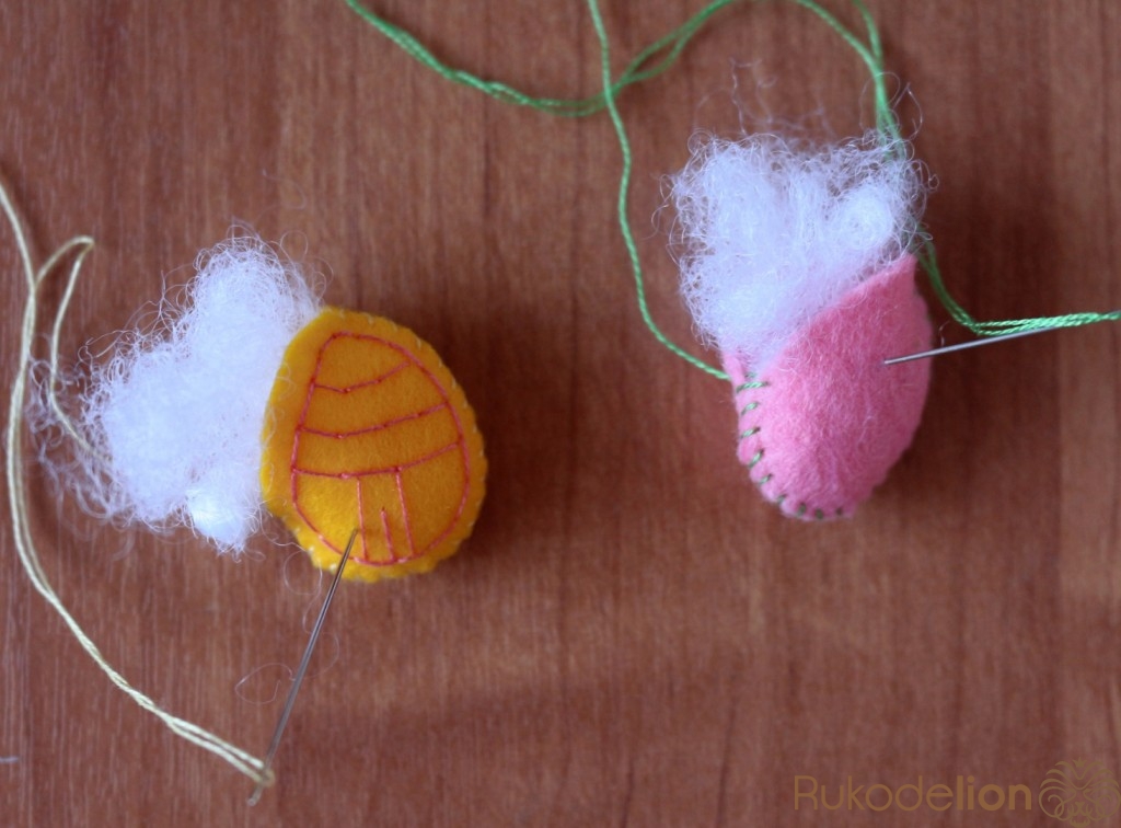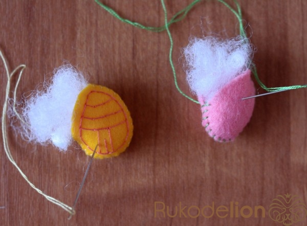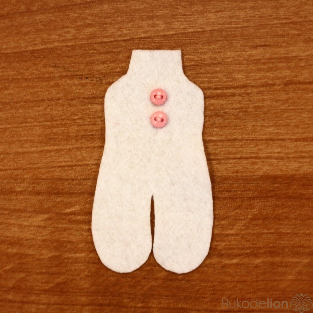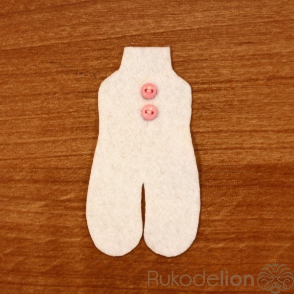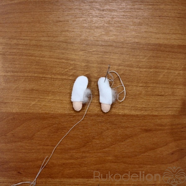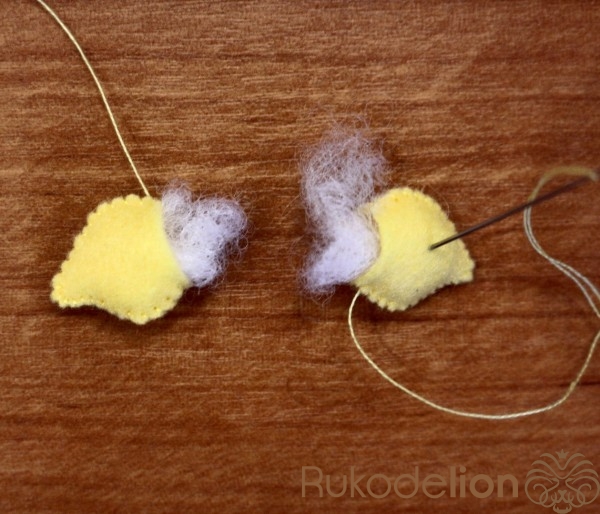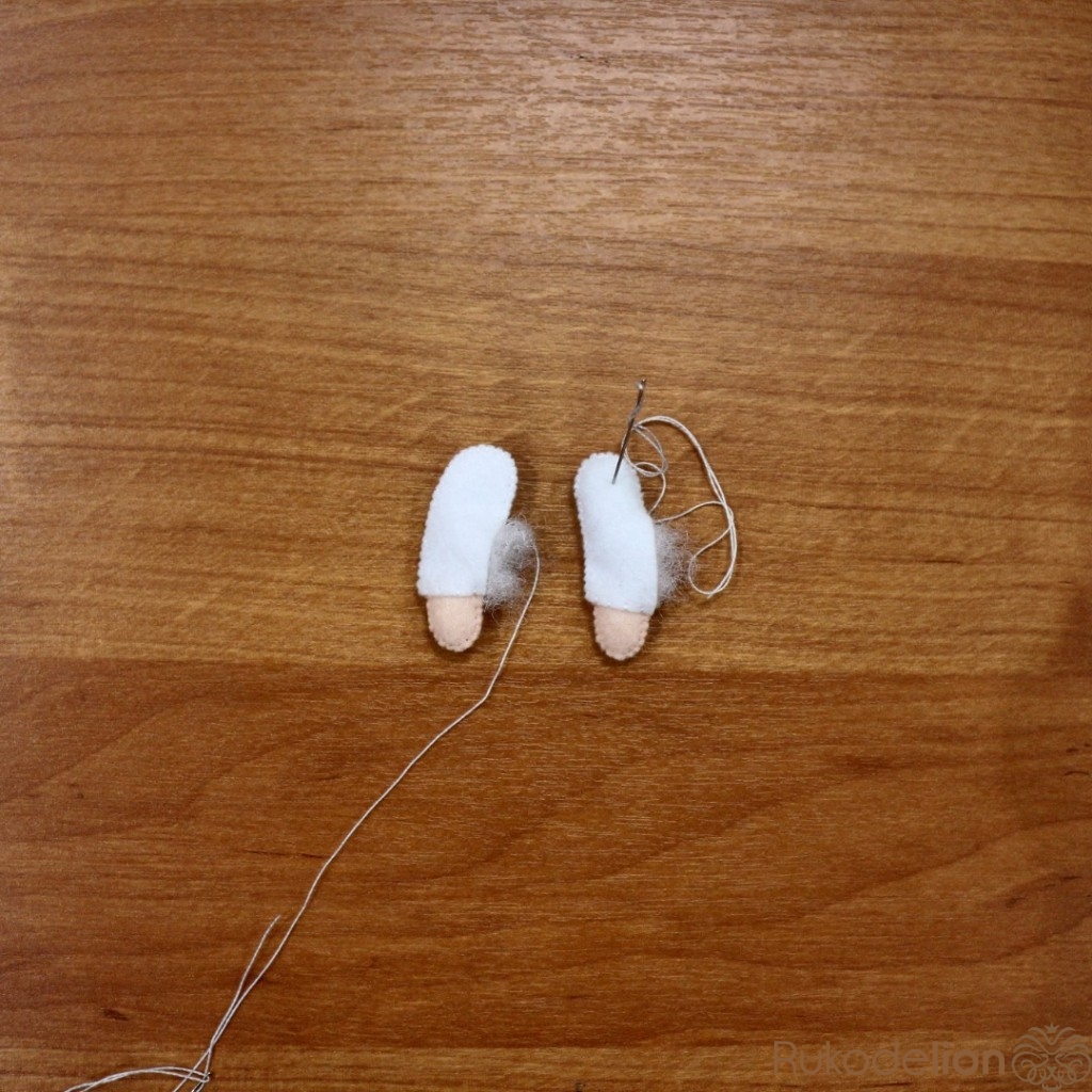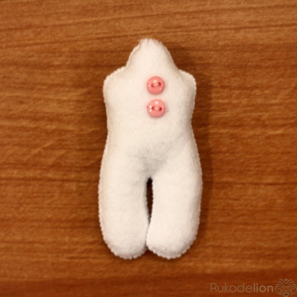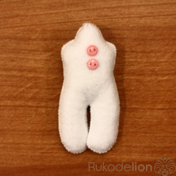 Берем одну часть туловища и пришиваем маленькие пуговки (можно и не пришивать, как хотите). Далее накладываем две части туловища друг на друга и сшиваем швом whip stitch, (как делали с хвостиками), оставляем сбоку снова отверстие и набиваем туловище. Закрываем отверстие, когда туловище заполнено синтетическим наполнителем. Шею проходим вокруг сметочным швом и просто затягиваем, закрепляем нить.