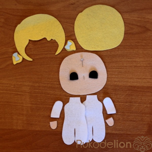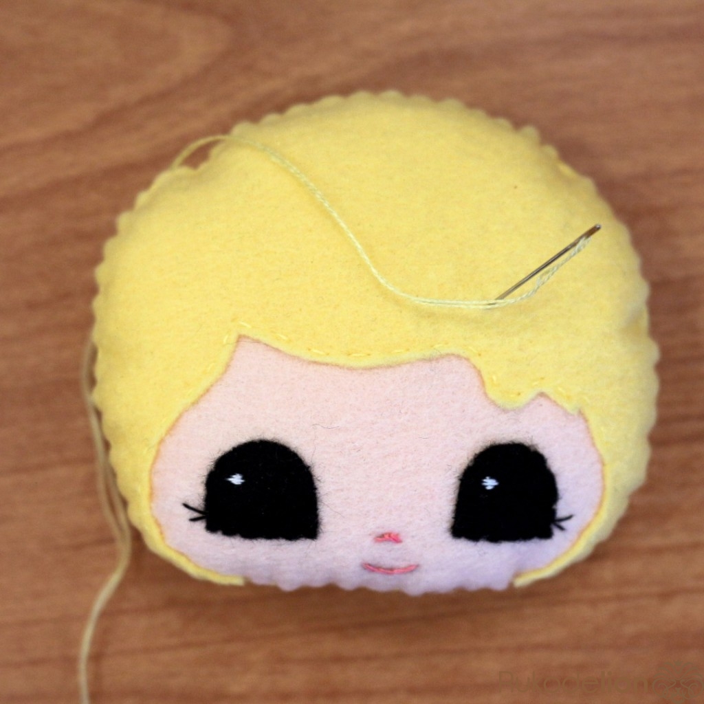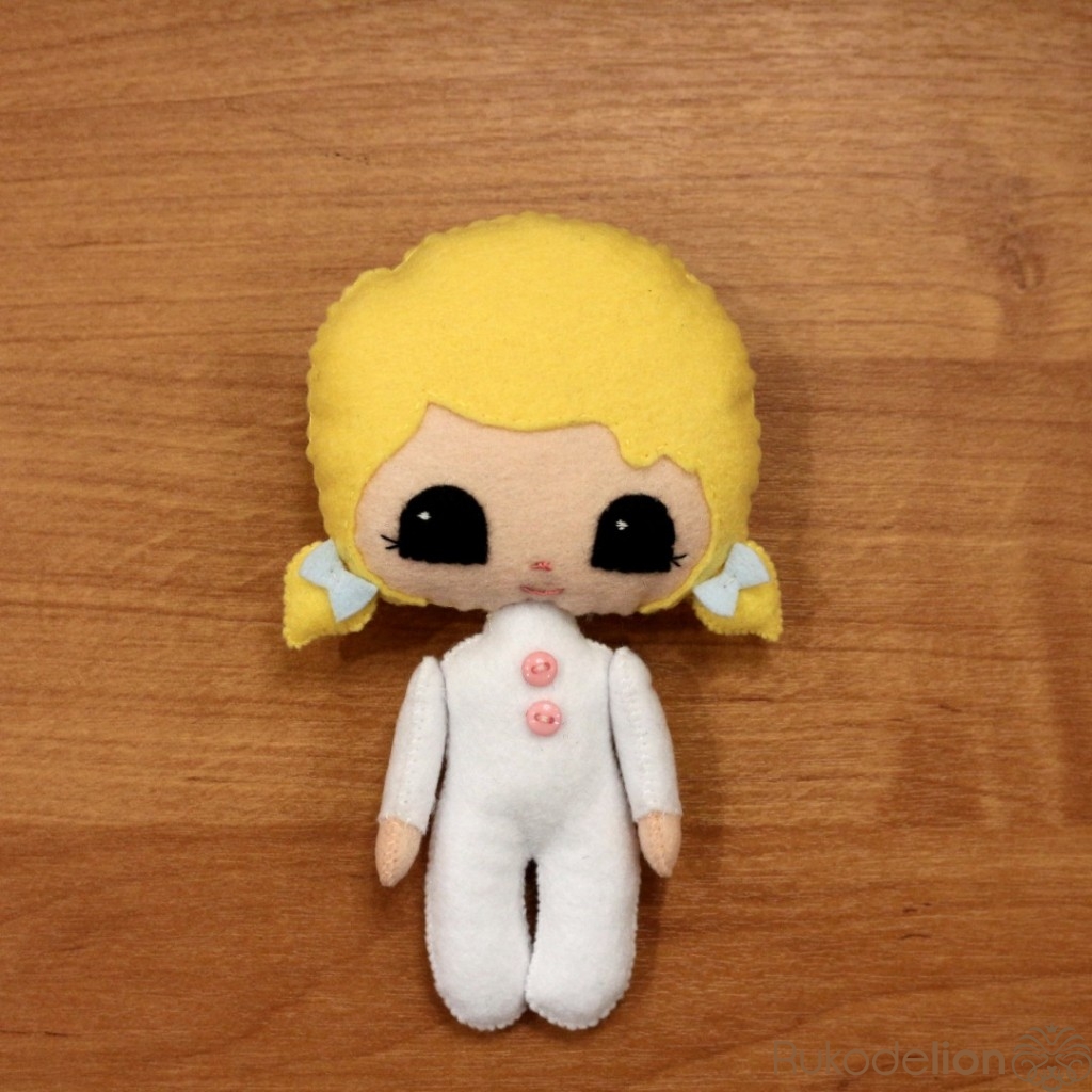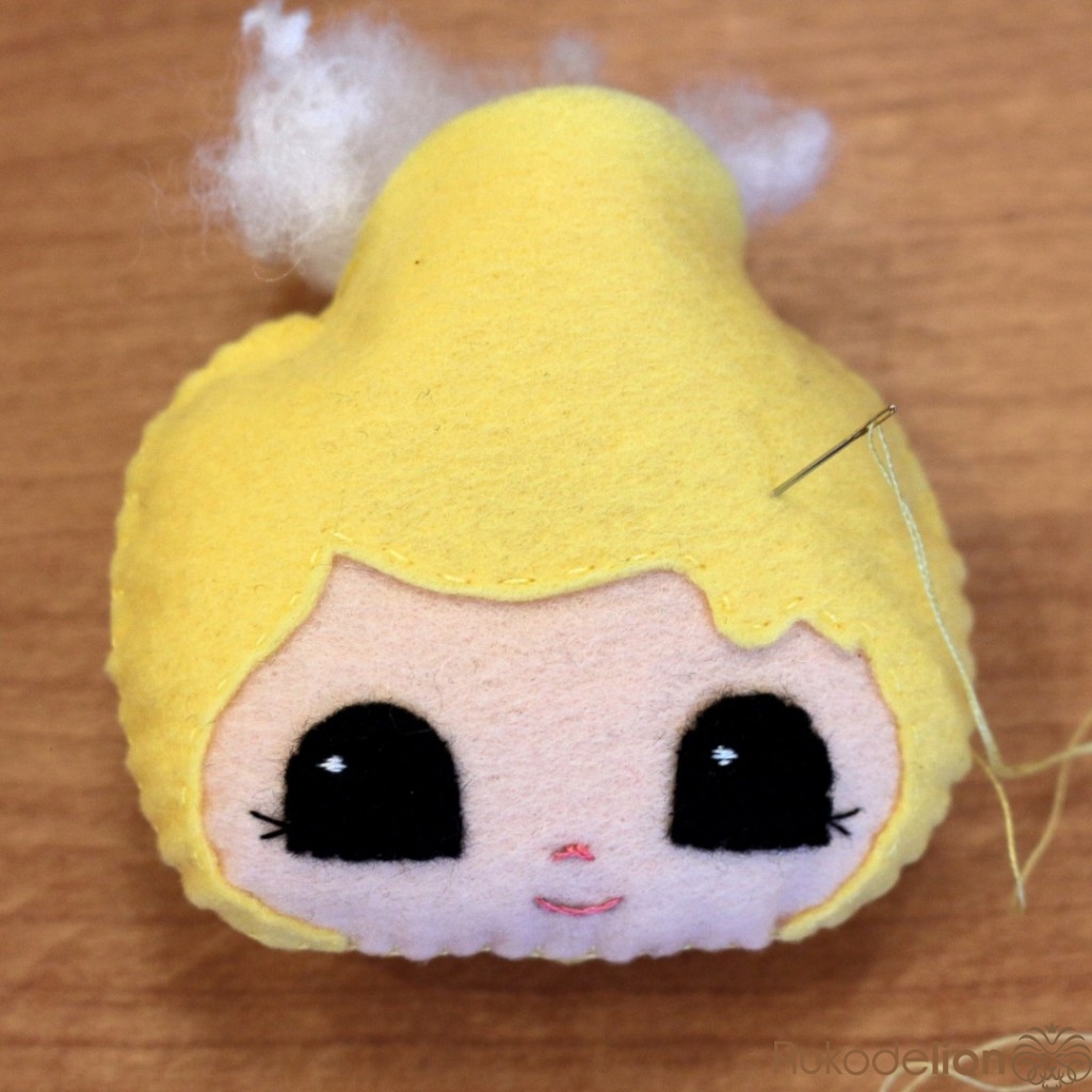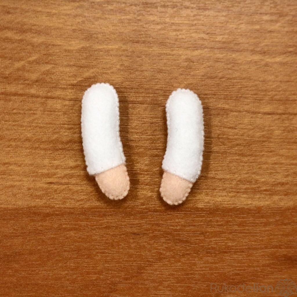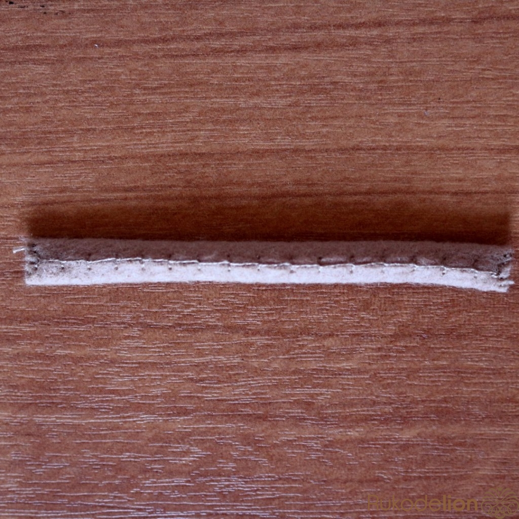 Берем одну часть туловища и пришиваем маленькие пуговки (можно и не пришивать, как хотите). Далее накладываем две части туловища друг на друга и сшиваем швом whip stitch, (как делали с хвостиками), оставляем сбоку снова отверстие и набиваем туловище. Закрываем отверстие, когда туловище заполнено синтетическим наполнителем. Шею проходим вокруг сметочным швом и просто затягиваем, закрепляем нить.