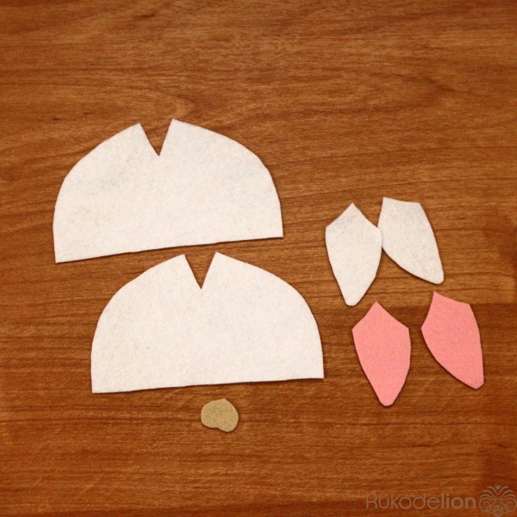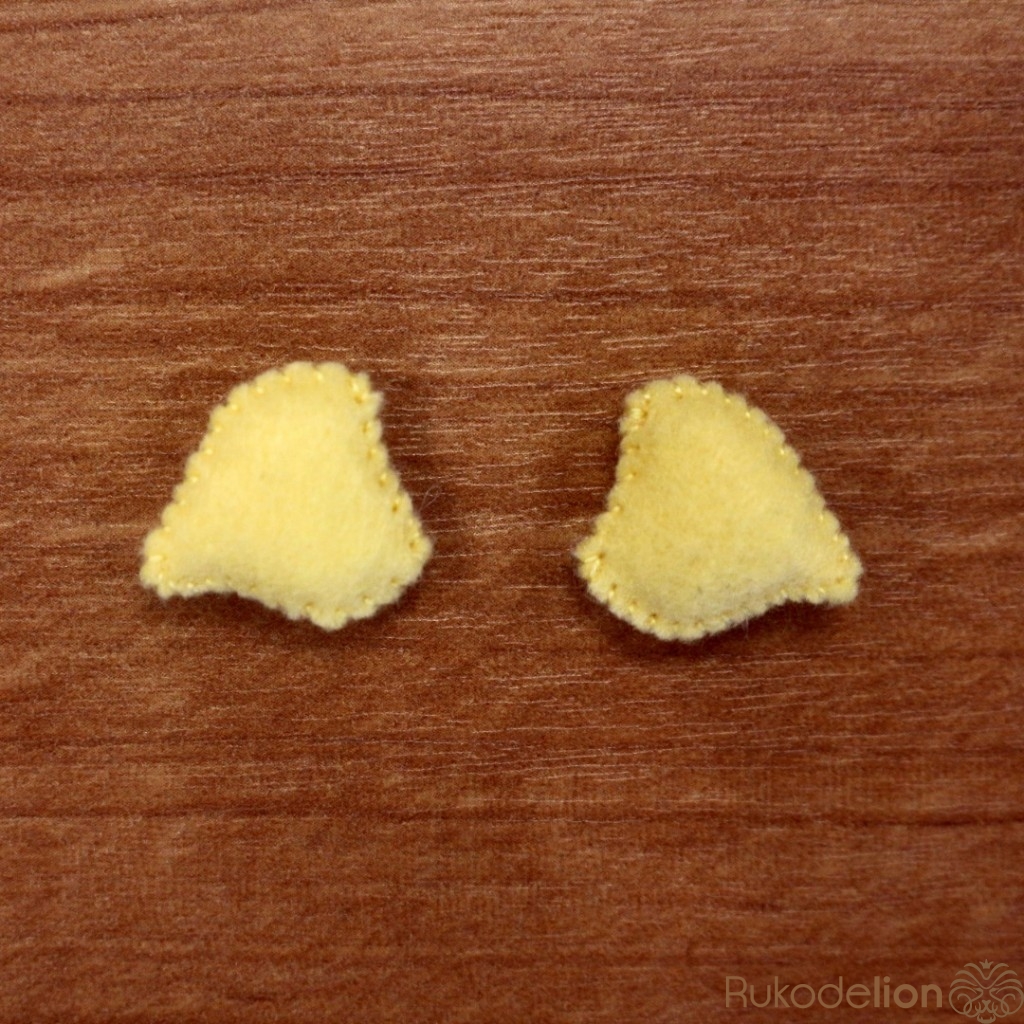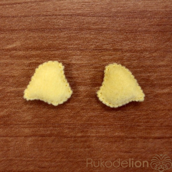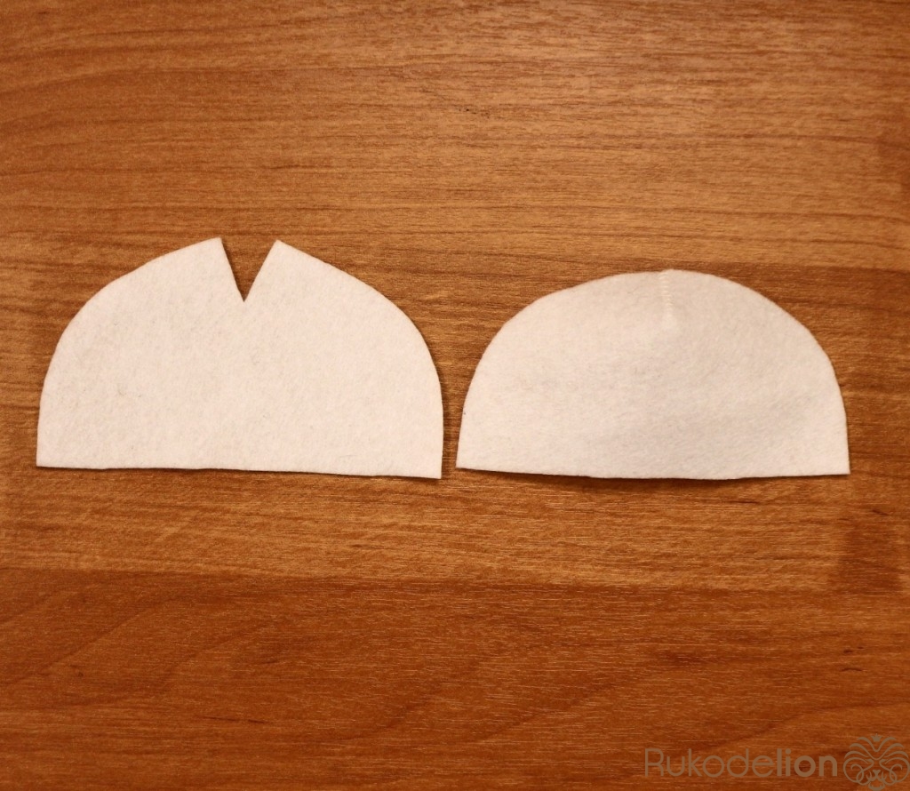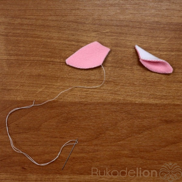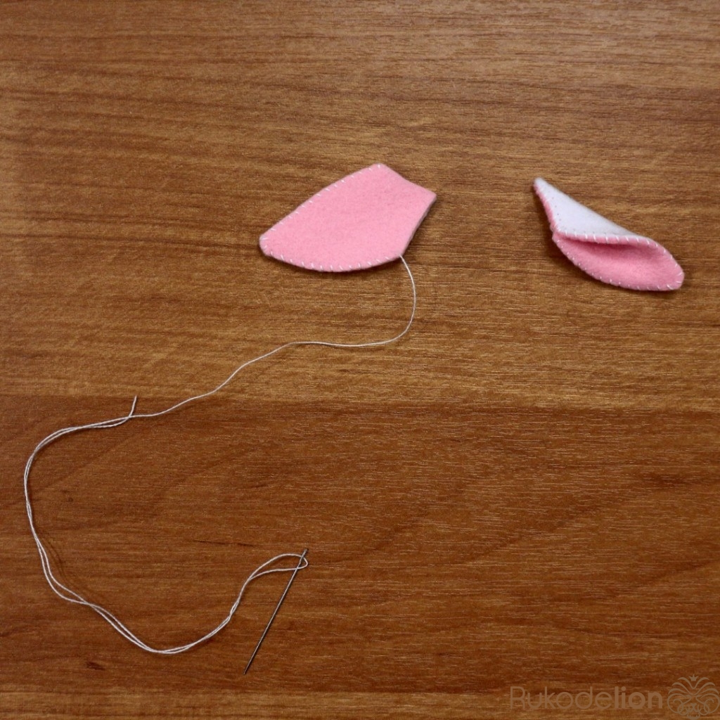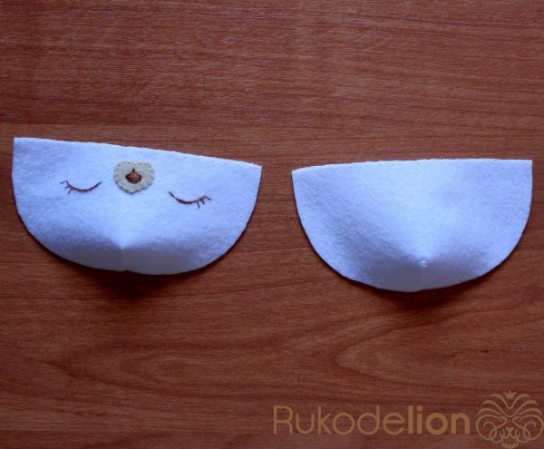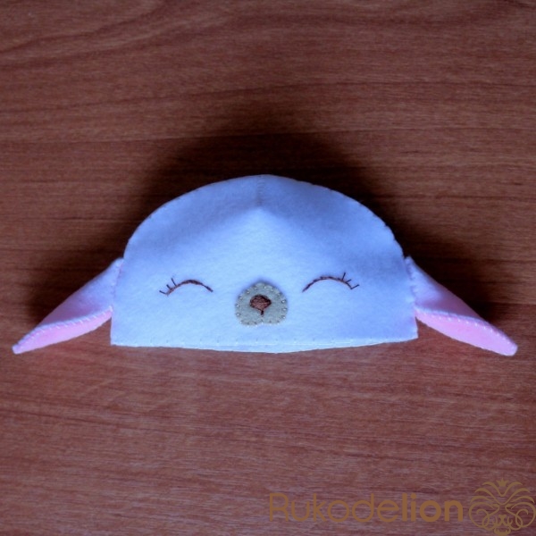 Нам нужно сделать мордочку кролика на одной из половинок шапочки. Пришиваем мордочку, на которой будет сам носик швом applique stitch (шов для аппликаций), вышиваем носик коричневыми нитками швом satin stitch. И в последнюю очередь вышиваем глазки швом stem stitch. Закрепляем все нитки с внутренней стороны.
