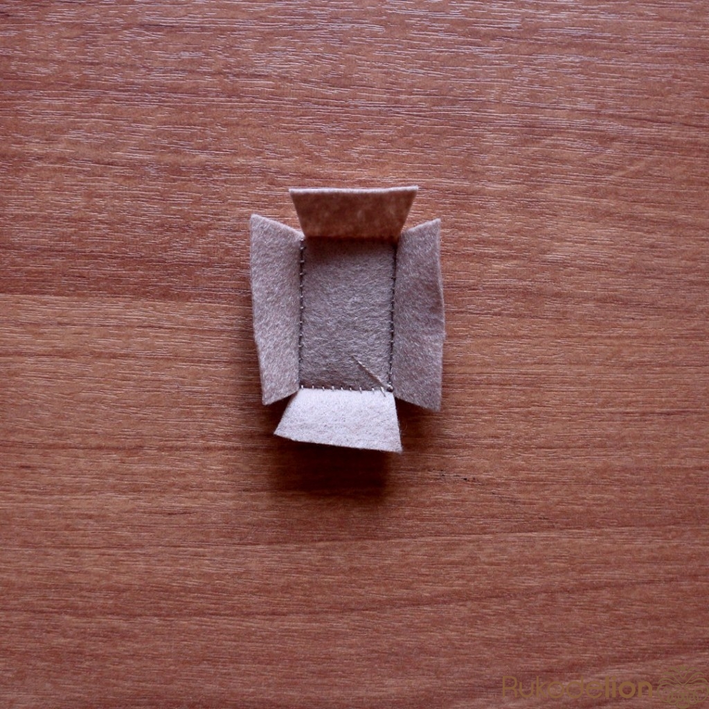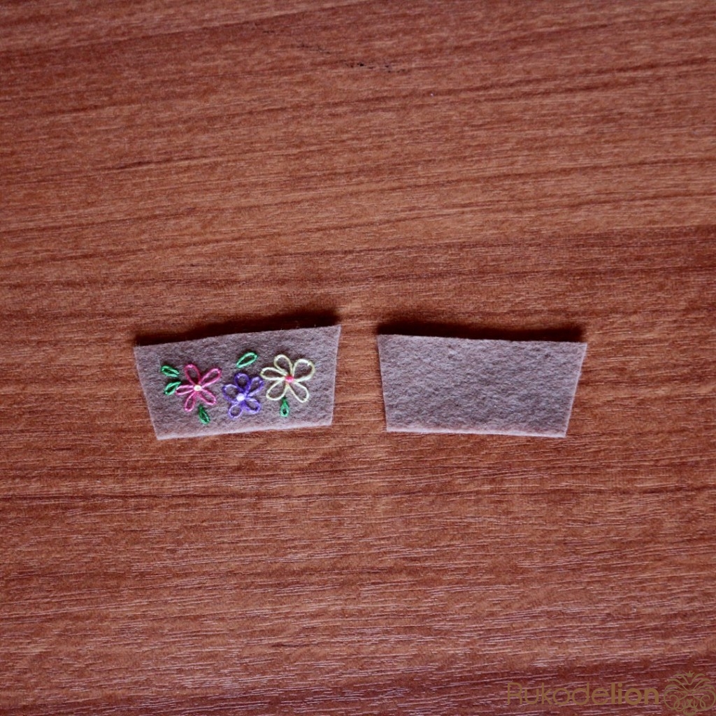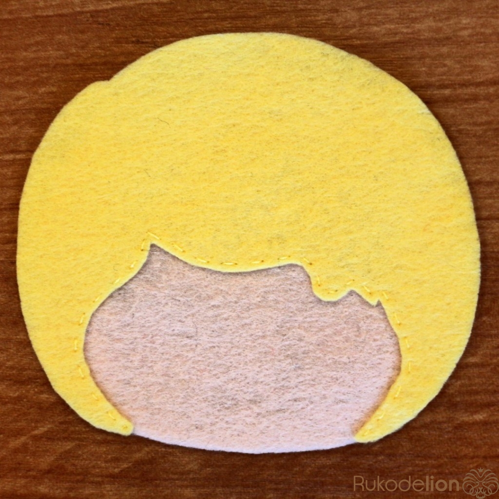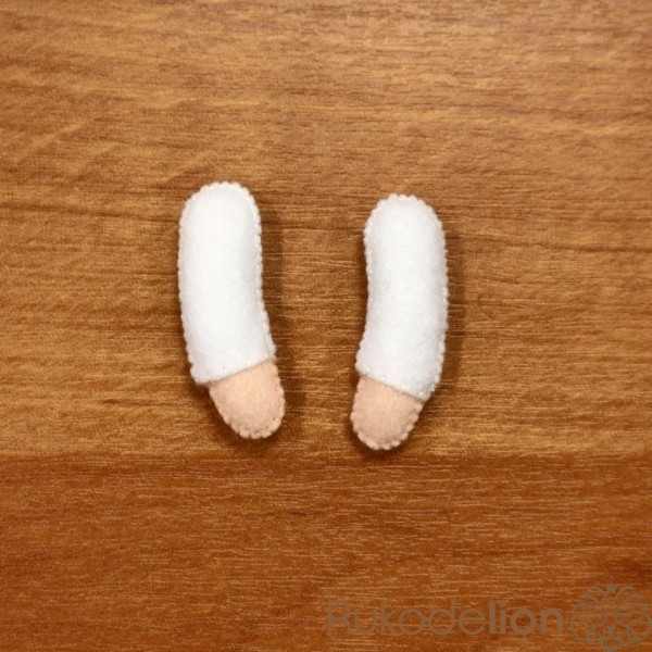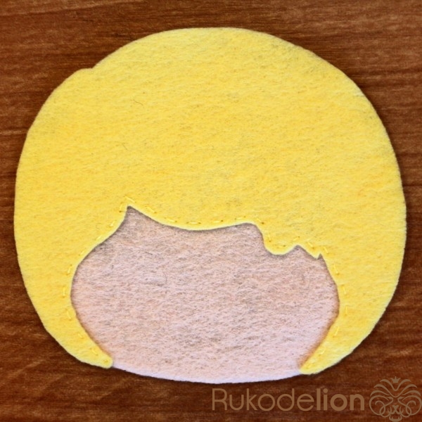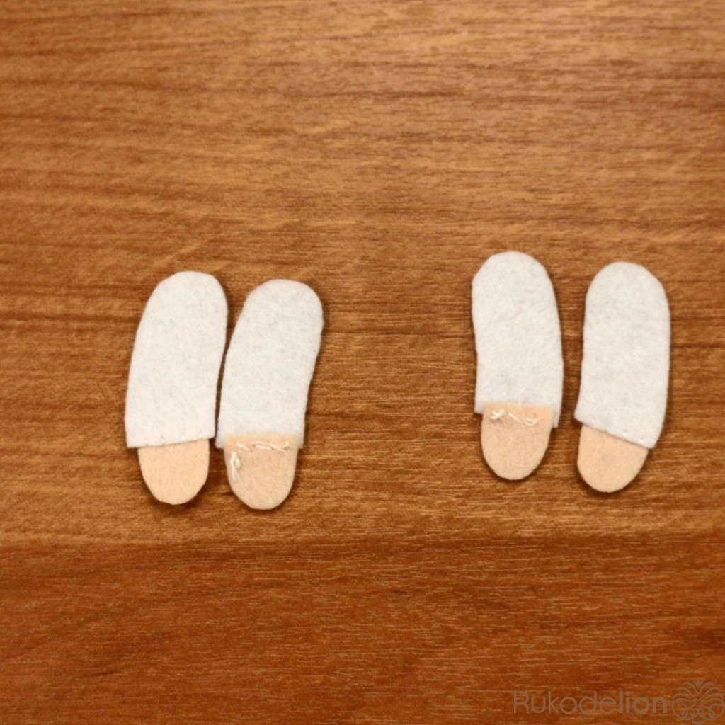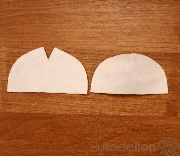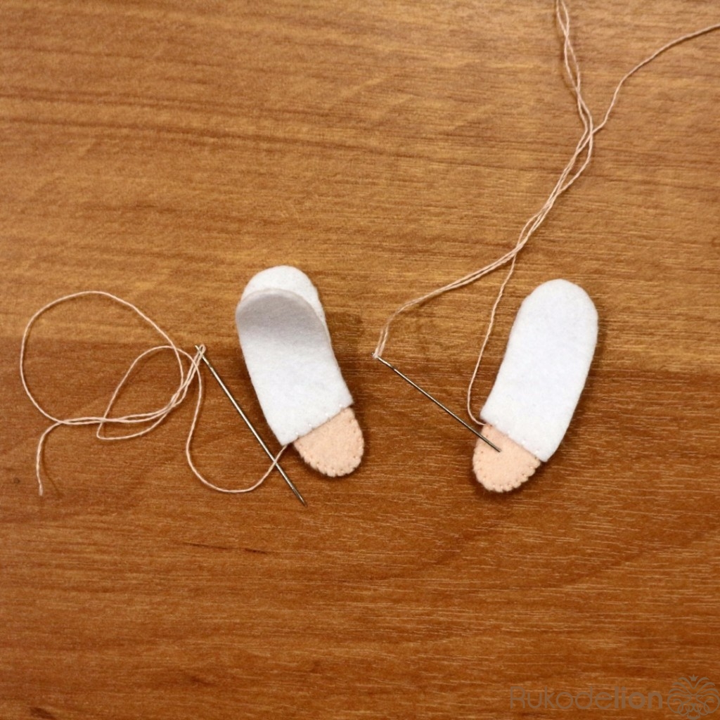 Нам нужно сделать мордочку кролика на одной из половинок шапочки. Пришиваем мордочку, на которой будет сам носик швом applique stitch (шов для аппликаций), вышиваем носик коричневыми нитками швом satin stitch. И в последнюю очередь вышиваем глазки швом stem stitch. Закрепляем все нитки с внутренней стороны.