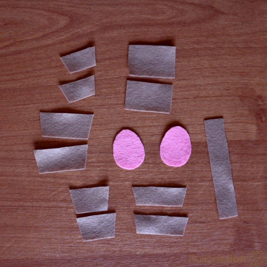 Так как кролик Пасхальный, ему обязательно нужна корзинка с Пасхальными яичками. Для этого вырезаем части для корзинки и Пасхальных яичек. Четыре боковые части корзинки меньшего размера и такие же части, но только чуть большего размера, а так же дно корзинки тоже меньшего и большего размера и ручку для корзинки. Две части на каждое Пасхальное яичко (можно какого угодно цвета).