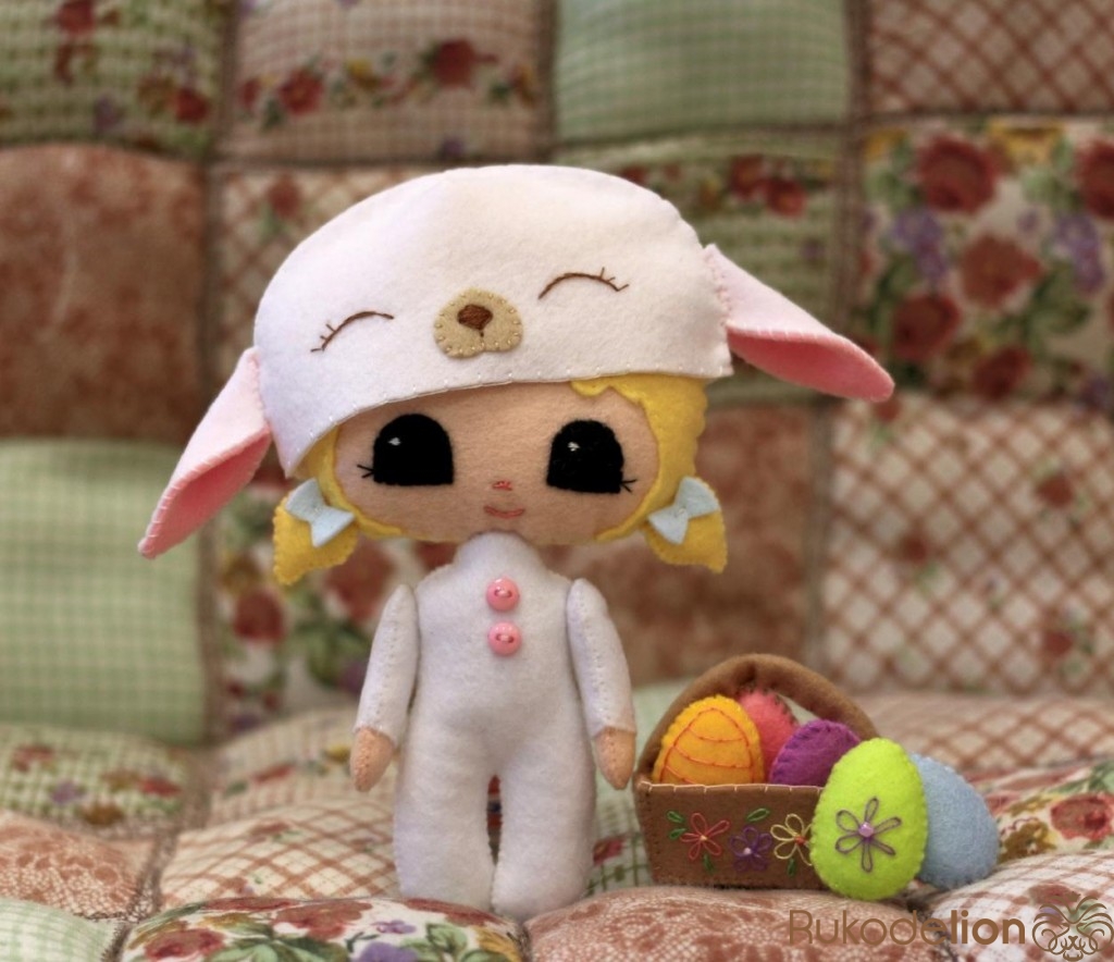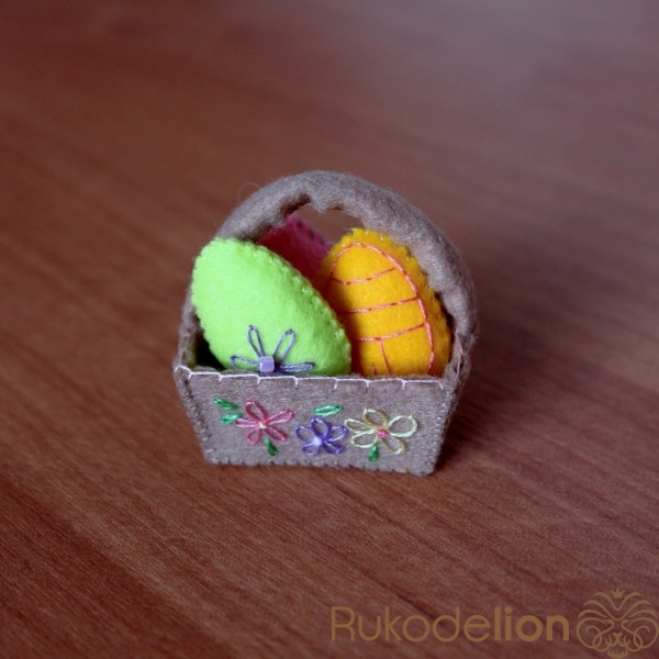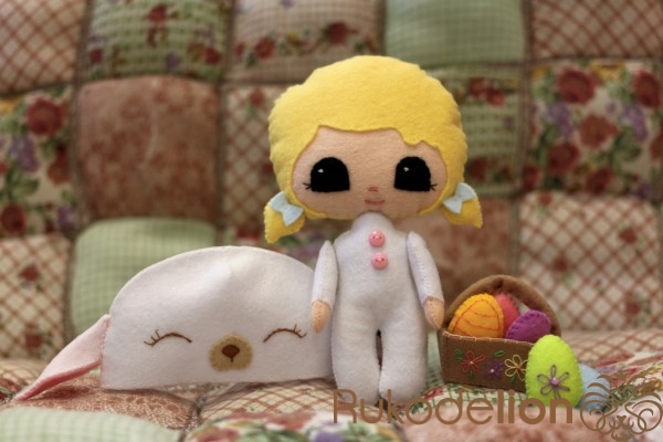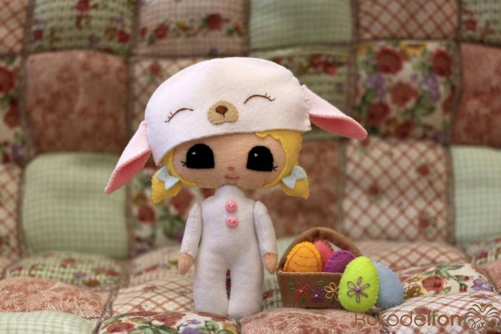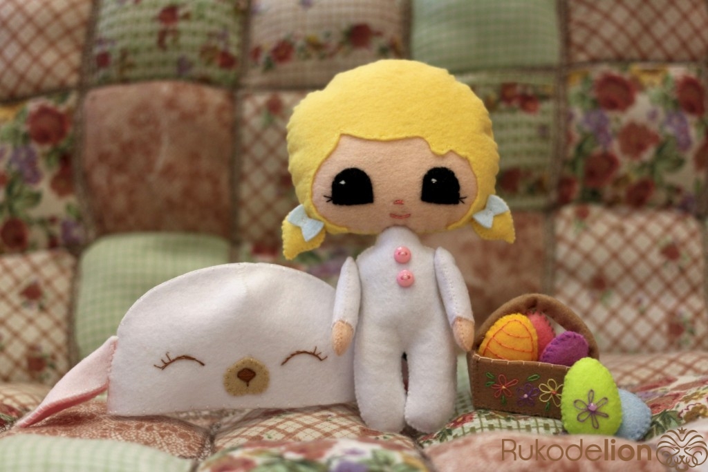 Кукла в костюме Пасхального кролика и корзинкой с Пасхальными яичками. Все сделано из фетра.