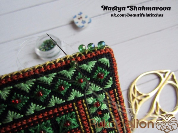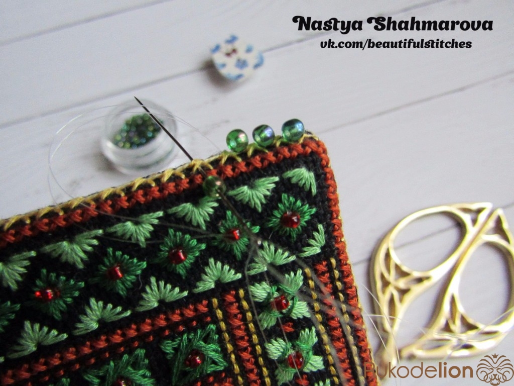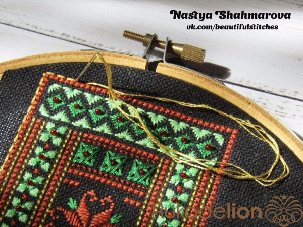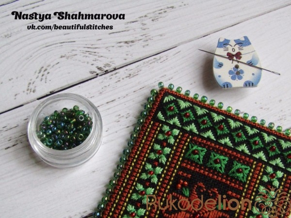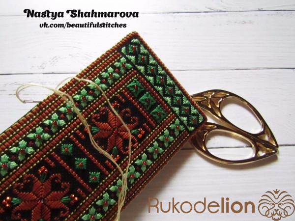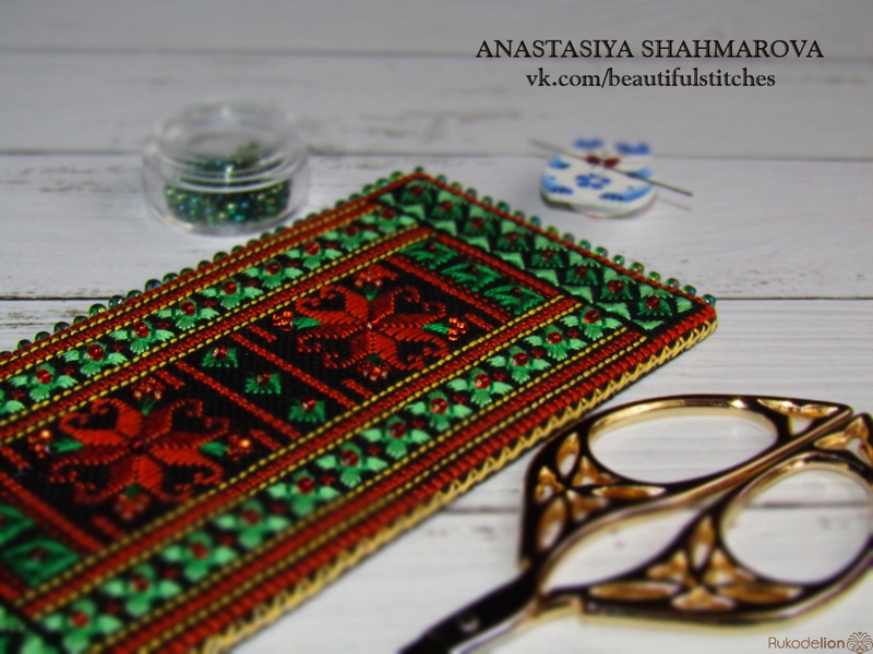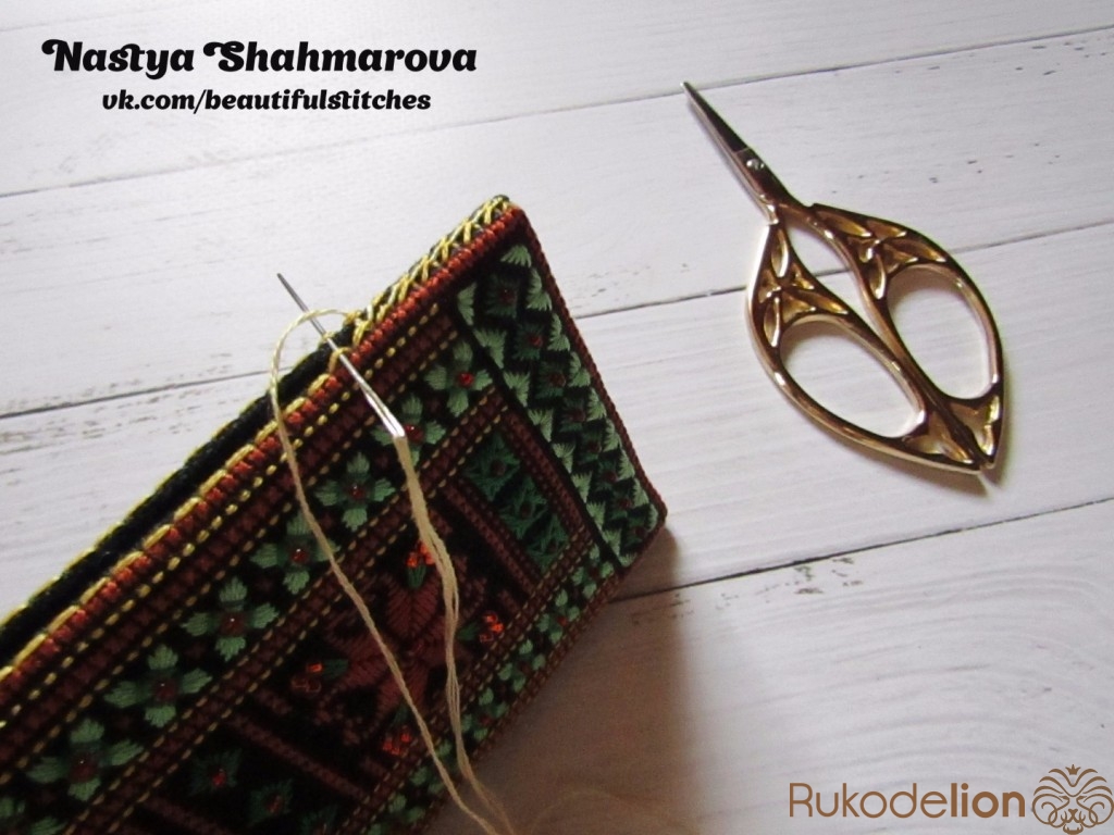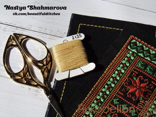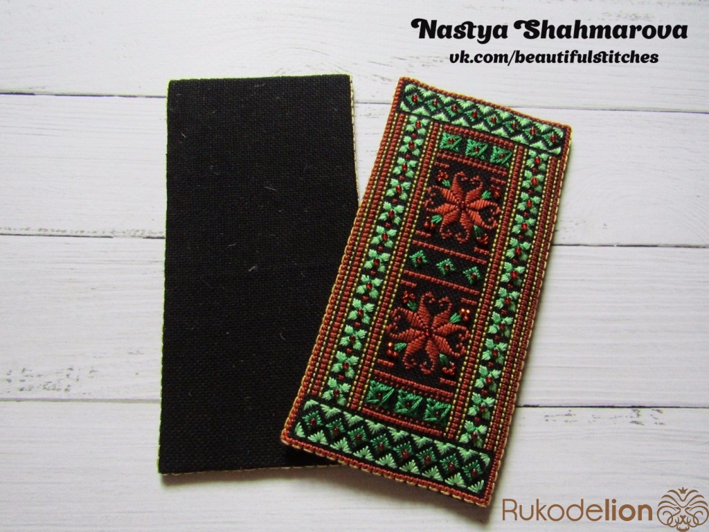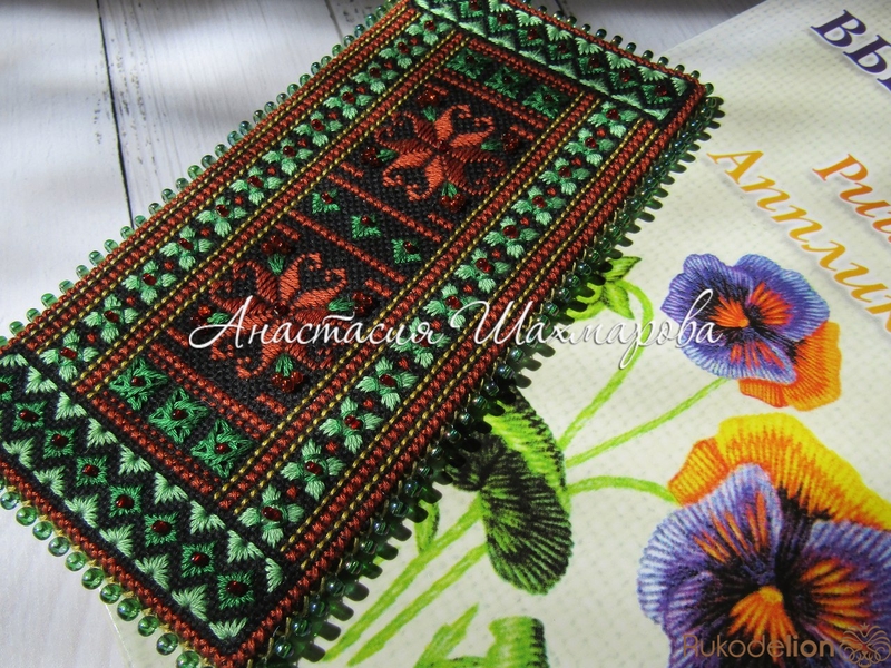 По периметру закладки прокладываем стежки швом "назад иголку". Если вы вышили закладку на ткани равномерного переплетения, то стежки прокладываем через 4 нити основы, если вы вышили закладку на канве, то через 2 клетки. Цвет нити можно подобрать на свой вкус. Я использовала тот цвет мулине, которым вышивала бэкстич в дизайне.