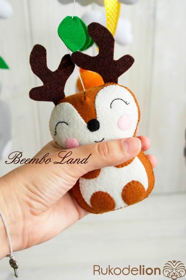 Из за обтекаемой формы игрушки удобно держать в руках. Все прошито, нет мелких деталей, а значит когда малыш перерастет мобиль игрушки можно срезать и превратить в игровой набор пищащих жителей леса.