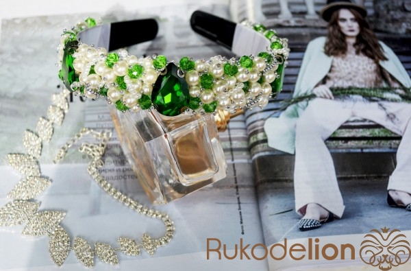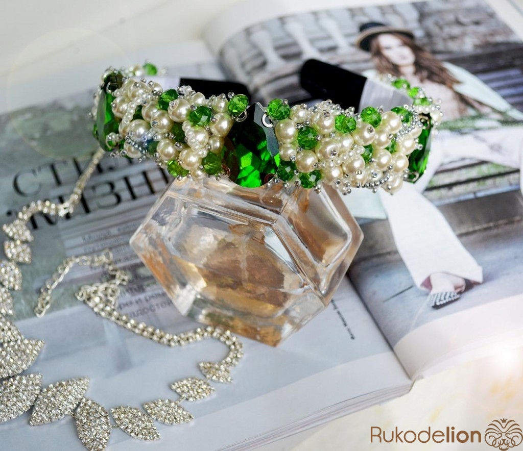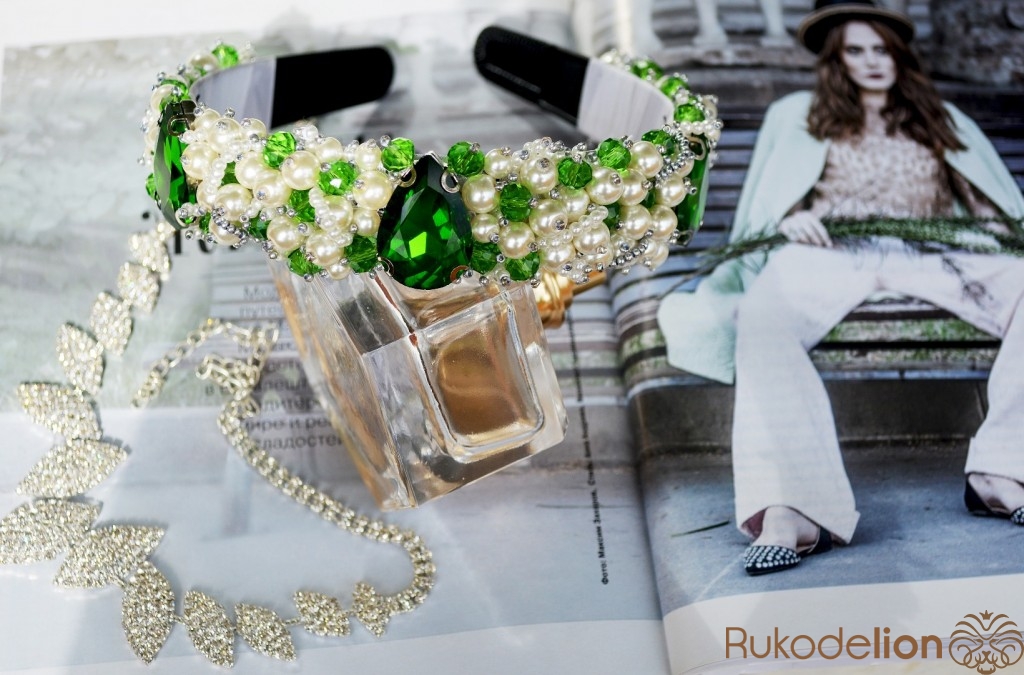 Свадебная корона для волос с зелеными камнями и жемчугом