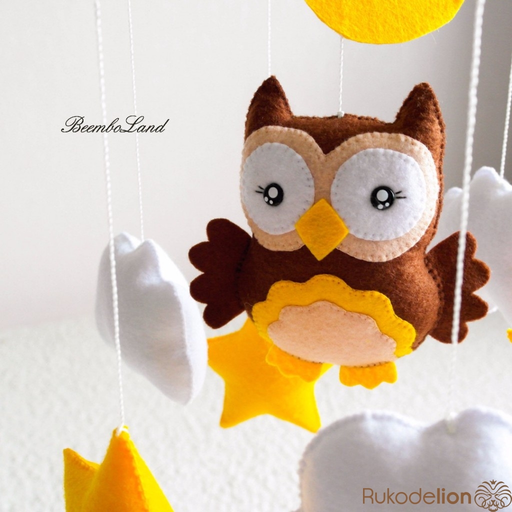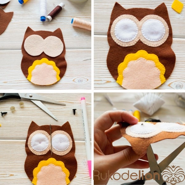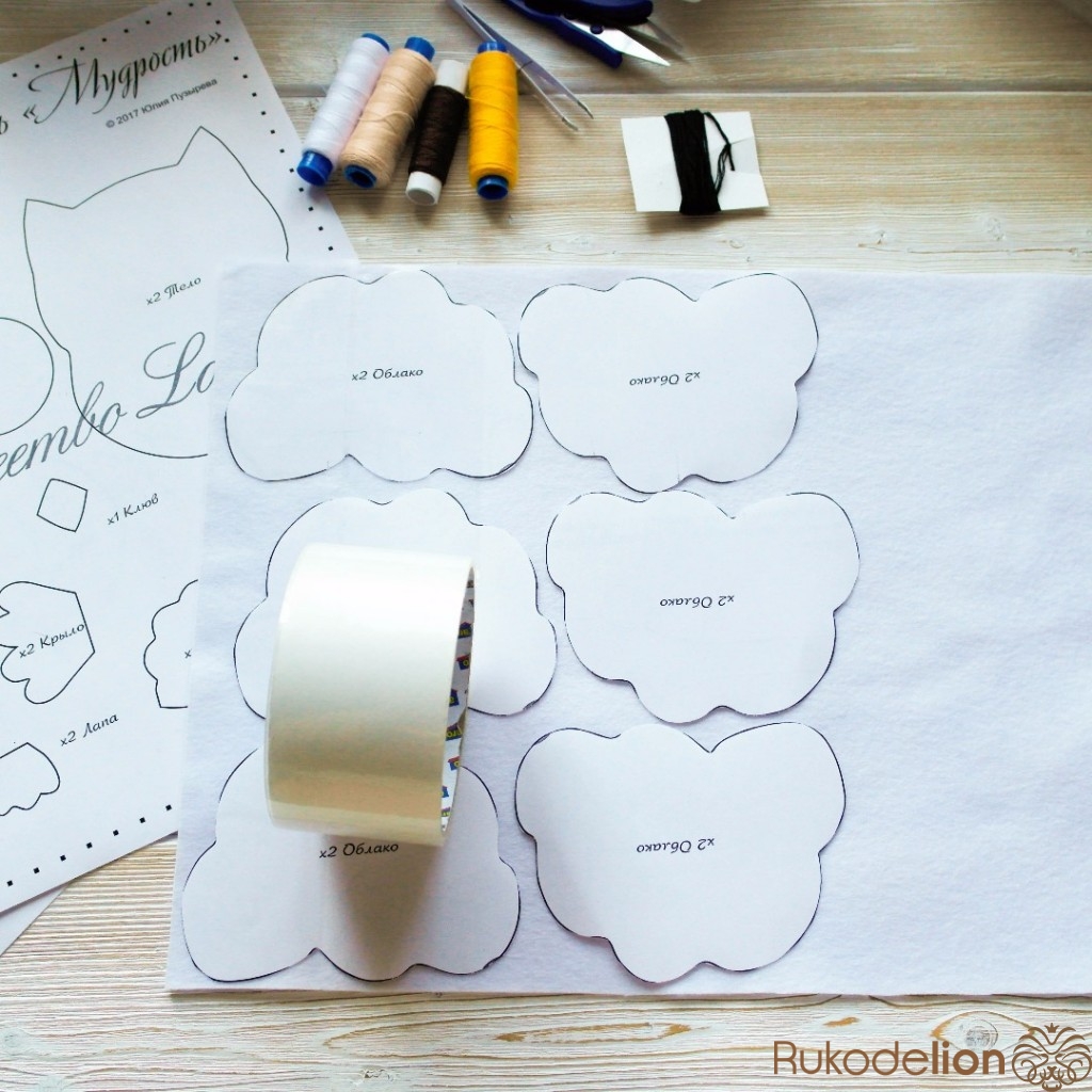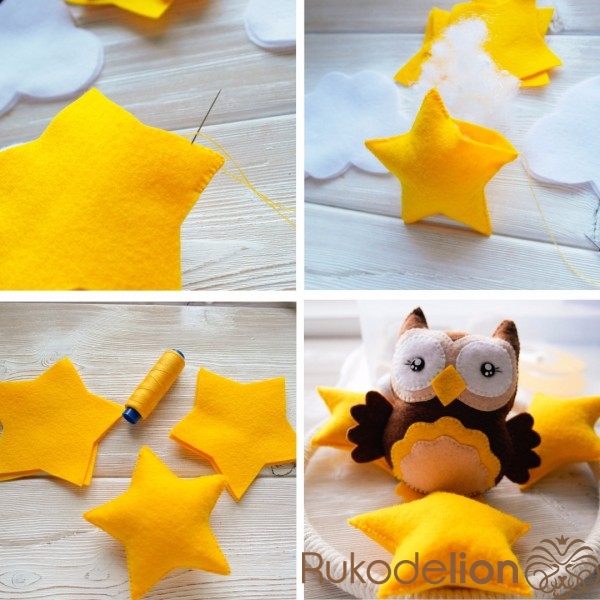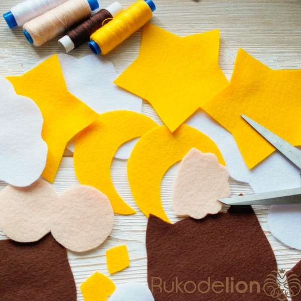 Раскроите все необходимые детали совы, Луны, звезд и облаков. Луну вырежьте из жесткого желтого фетра.