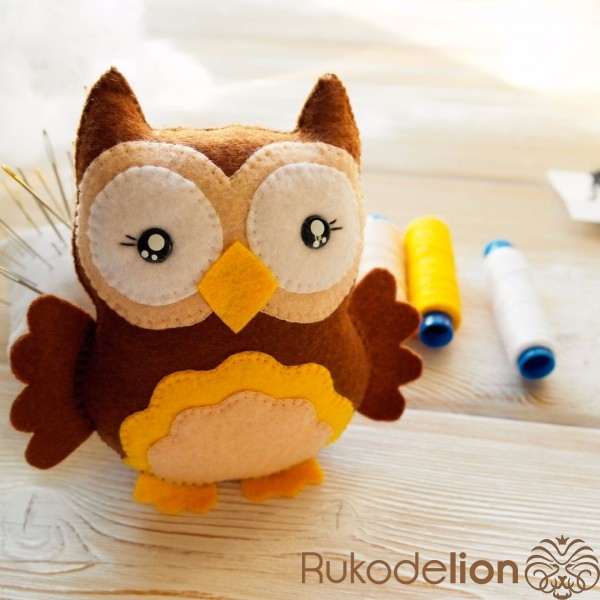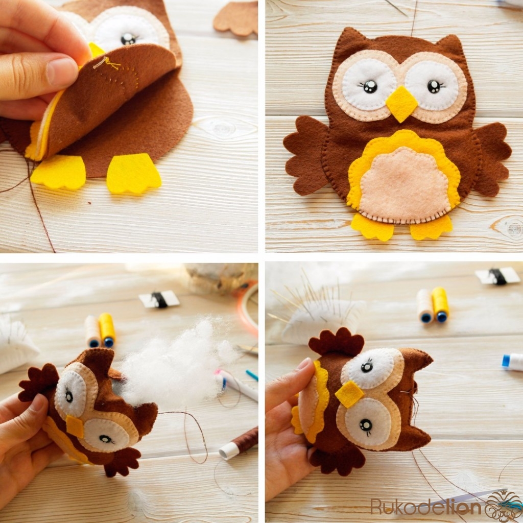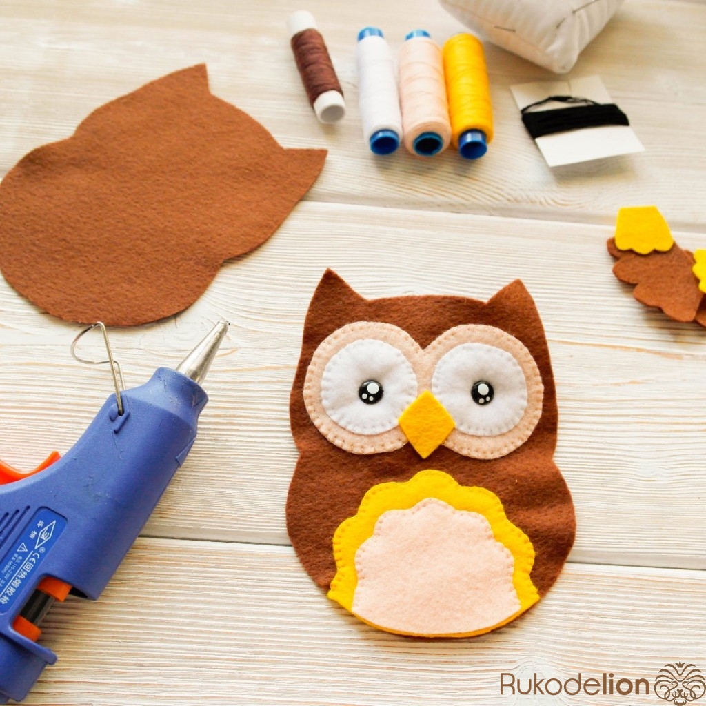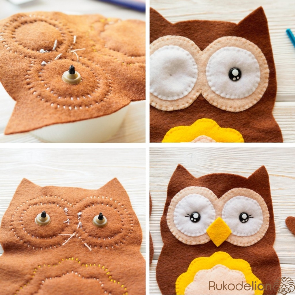 Раскроите все необходимые детали совы, Луны, звезд и облаков. Луну вырежьте из жесткого желтого фетра.