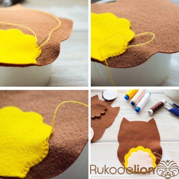 Петельным швом пришейте желтую, большую часть животика. Затем поверх желтой пришейте меньшую часть — бежевую.