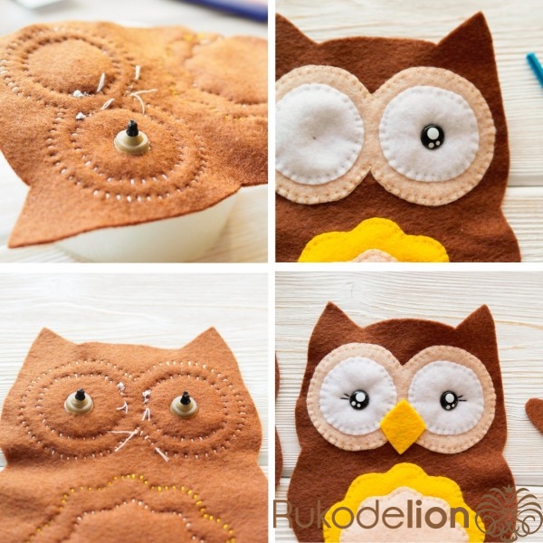 Пришиваем бежевую часть глаз, поверх нашиваем белую. Так же используем петельный шов.