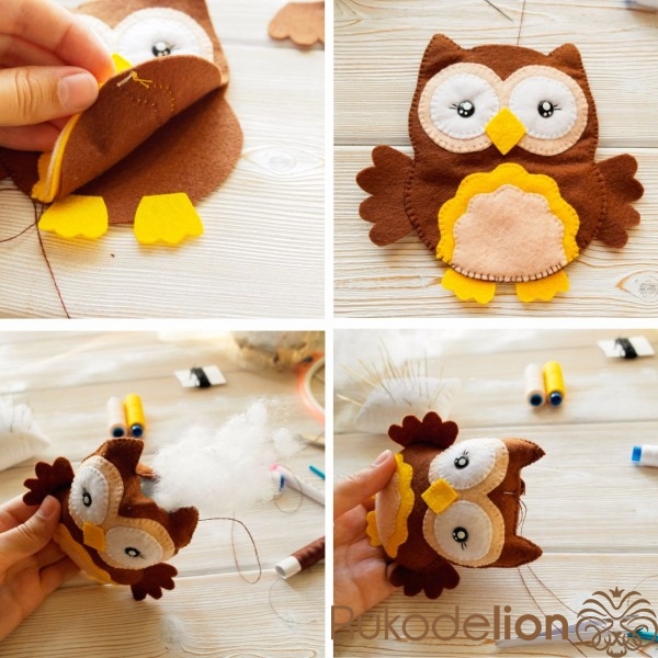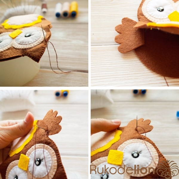 Лапки вшиваются петельным швом по аналогии с крыльями. Когда вернетесь обратно к головке, сшив ушко, оставьте небольшое отверстие. Затем очень плотно наполните внутреннее пространство холлофайбером (или любым другим наполнителем). После этого сшиваем до конца туловище и закрепляем нить, спрятав ее под шов.