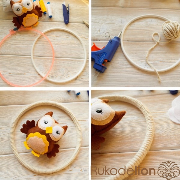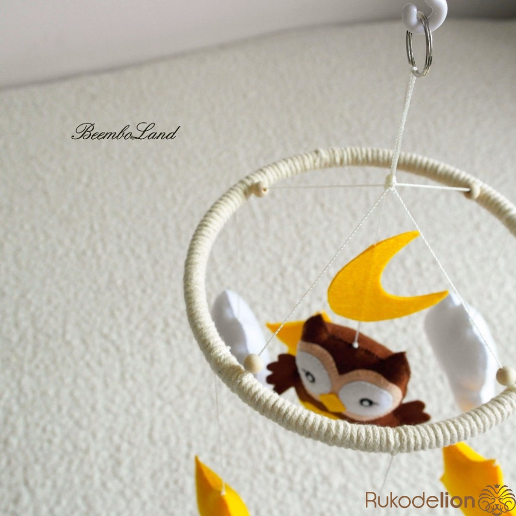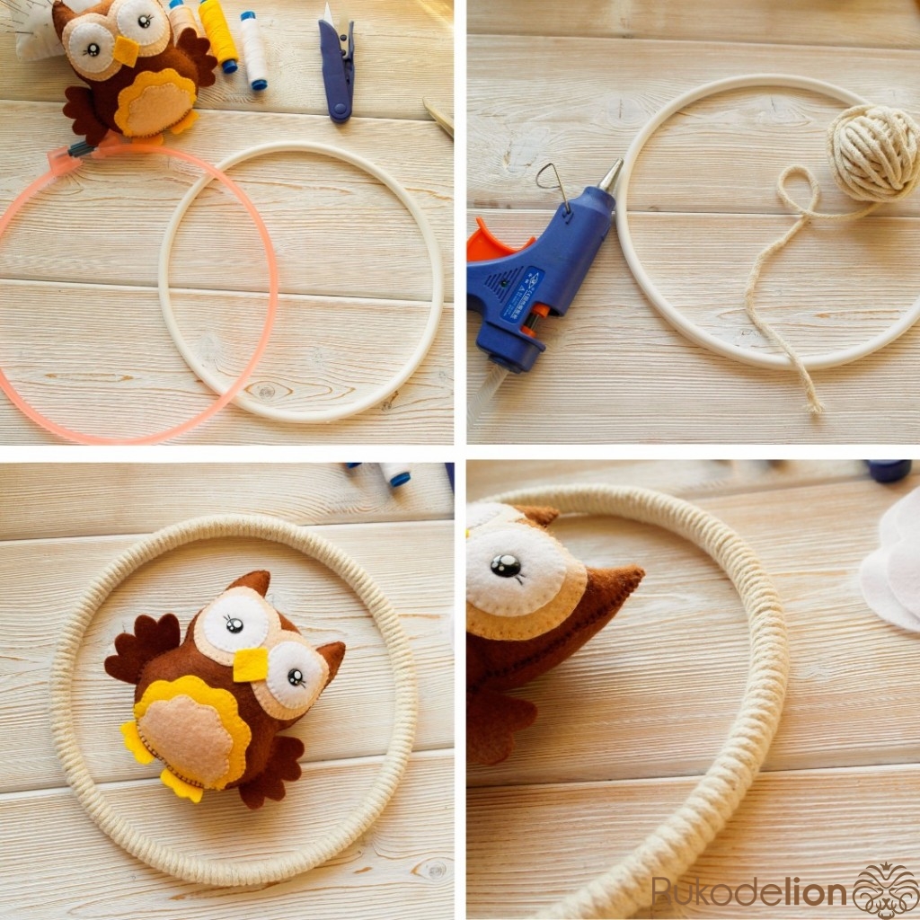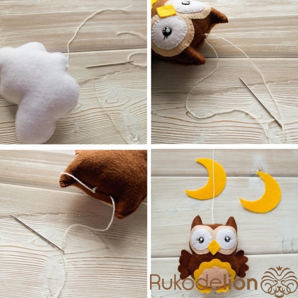 Прикрепите нитки ко всем игрушкам, а половинки Луны приклейте к нити над совой.