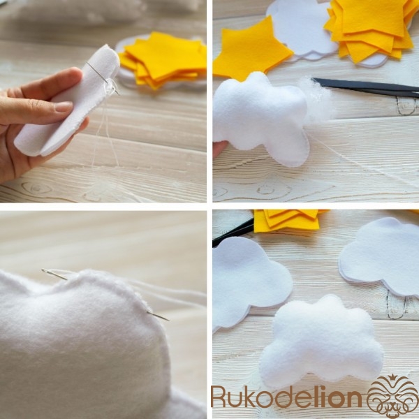 Сшиваем половинки петельным швом, оставляя небольшой промежуток в конце. Плотно набиваем наполнителем, расправляя и распределяя его равномерно пальцами, пинцетом или карандашом. Завершаем шов, прячем конец нити. Облачко должно получиться объемным и упругим.