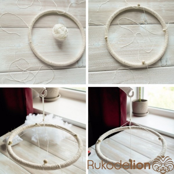 К подготовленной основе привязываем четыре нити друг напротив друга. Можно украсить их различными бусинами. Завязываем в центре петельку. Подвесив на кронштейн или любой удобный крючок, регулируем натяжение нитей, пока не получим плоскость, параллельную полу. Закрепите нити и обрежьте излишки.