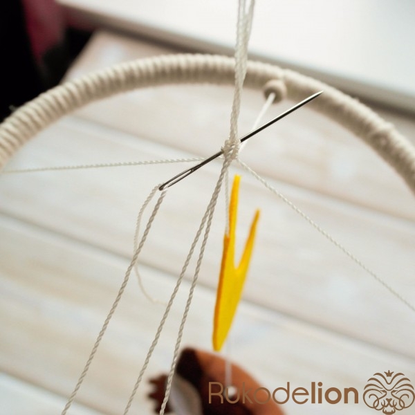 Теперь нужно прикрепить к игрушкам нити, чтобы затем начать собирать мобиль.