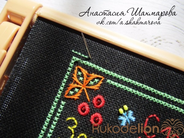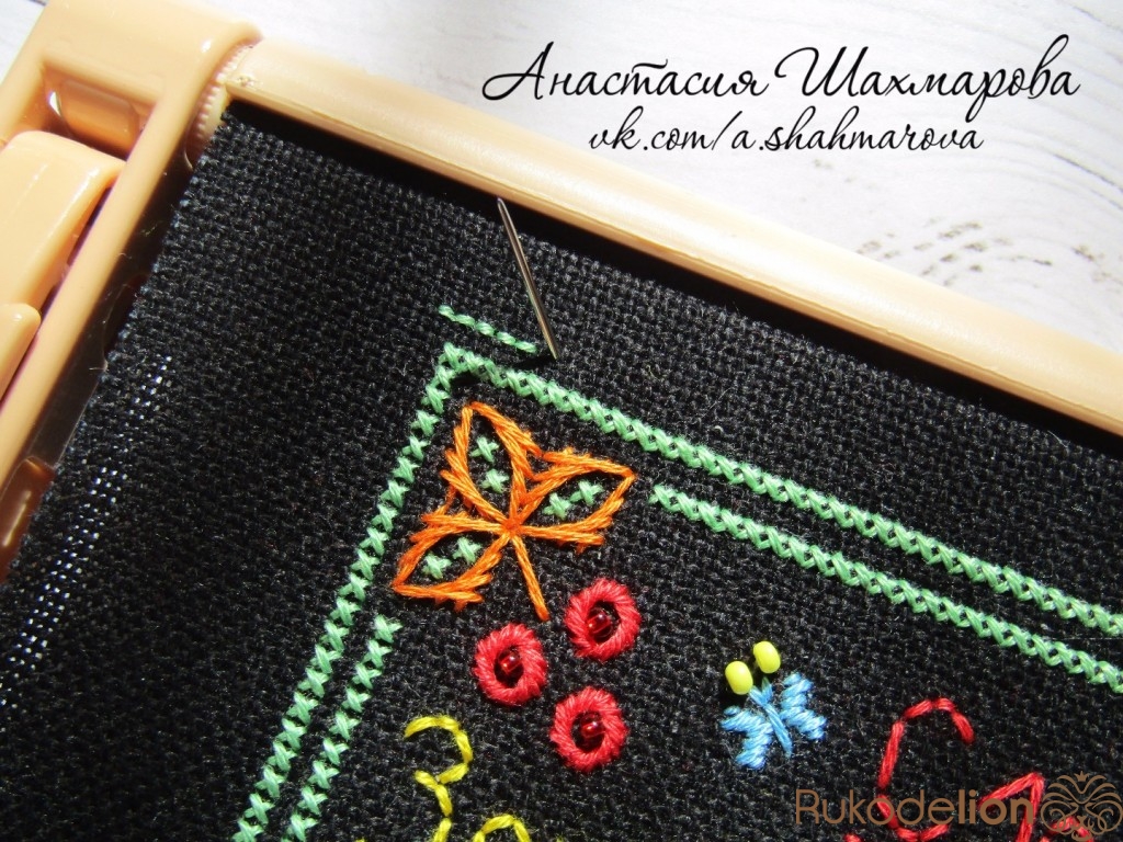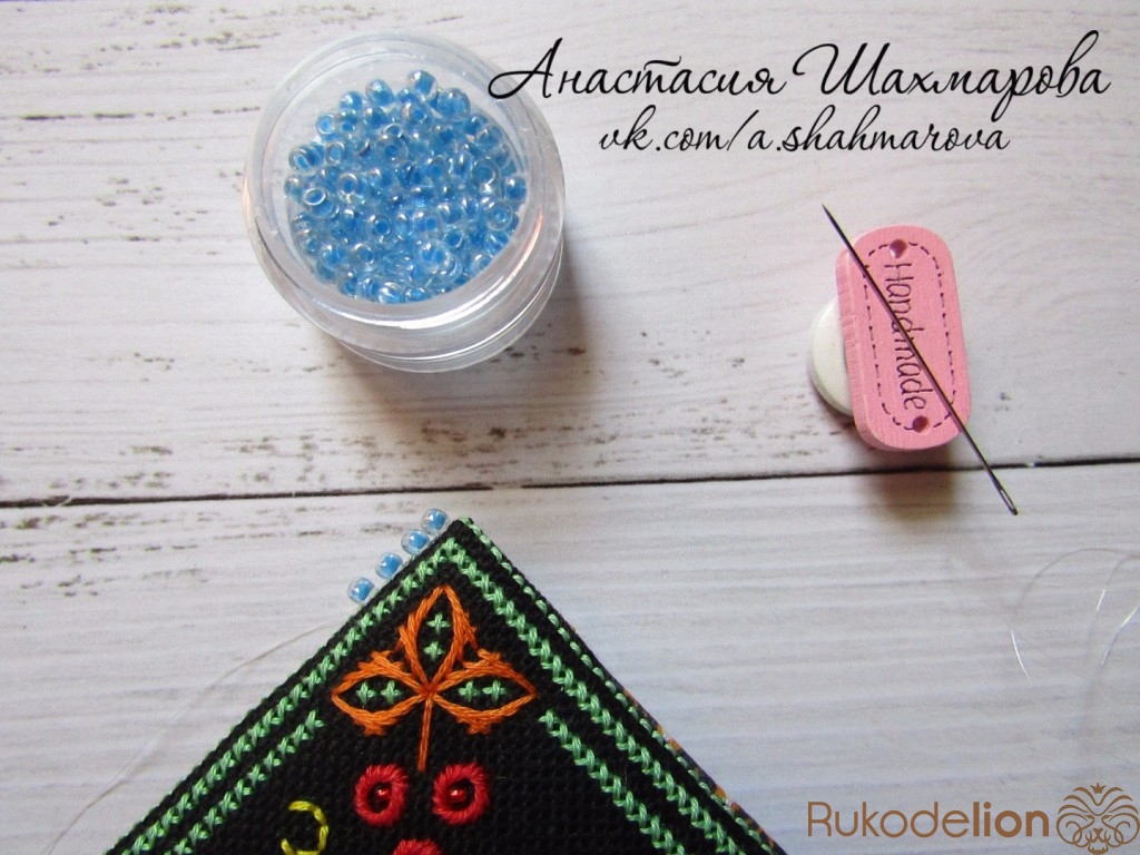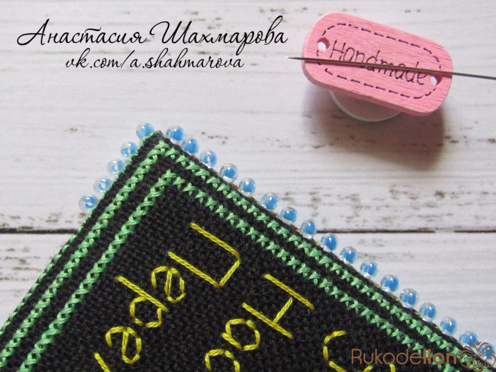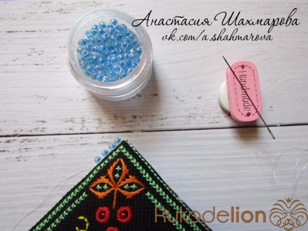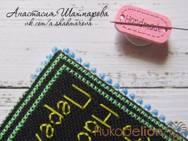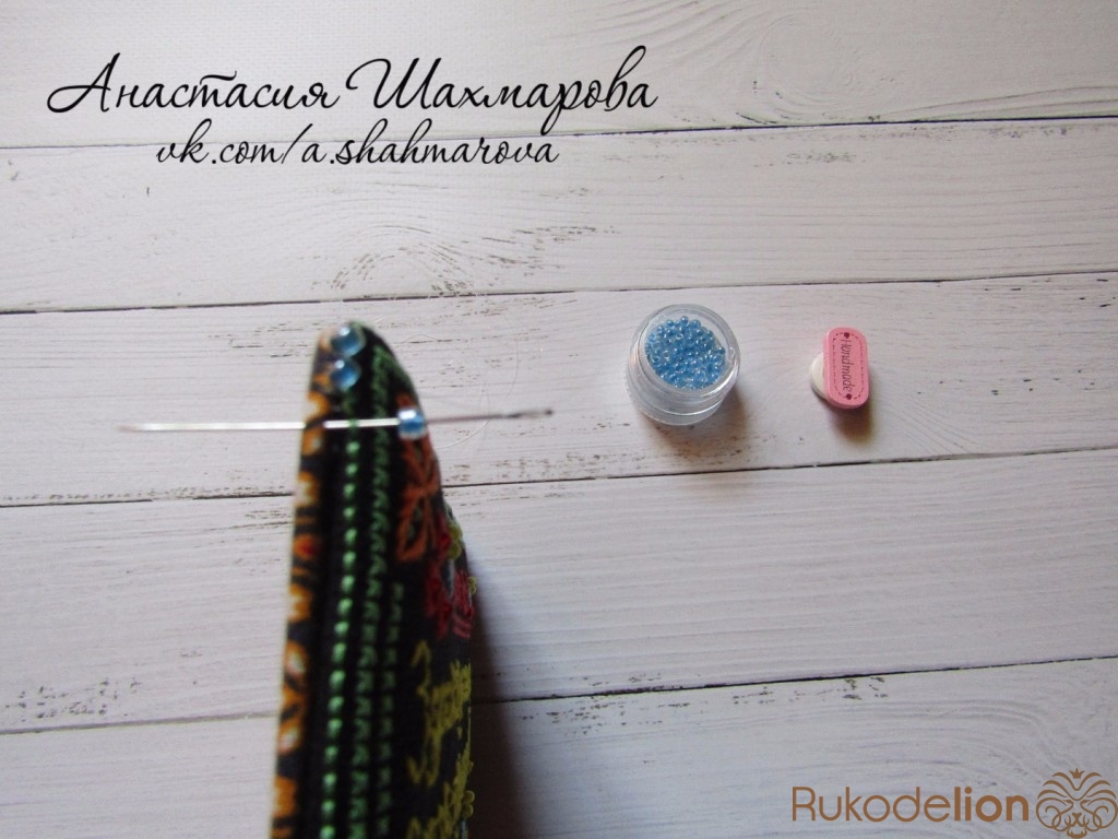 Начинаем сшивать обе детали, используя бисер (я использую мононить в два сложения). Закрепляем мононить петлёй. Продолжаем сшивать детали, чередуя бисер и "пустой" стежок.