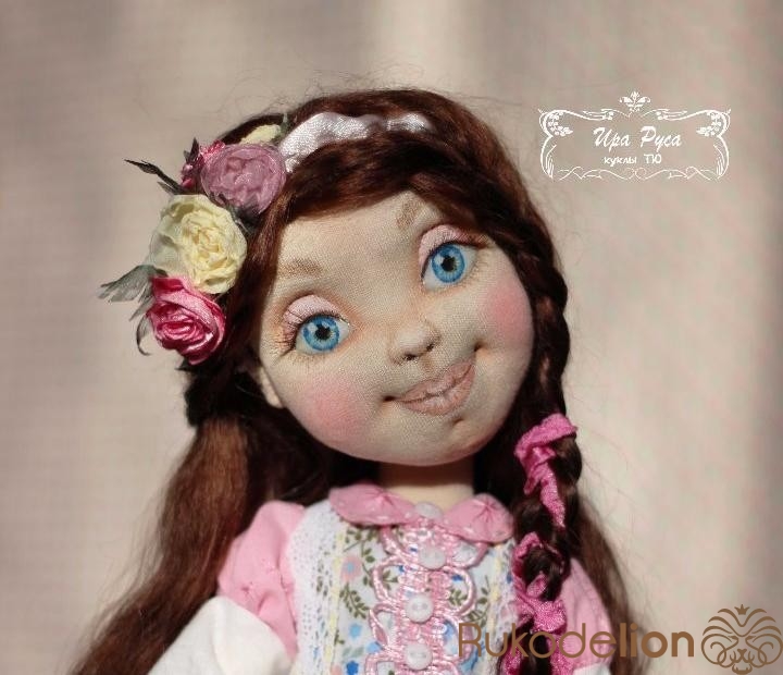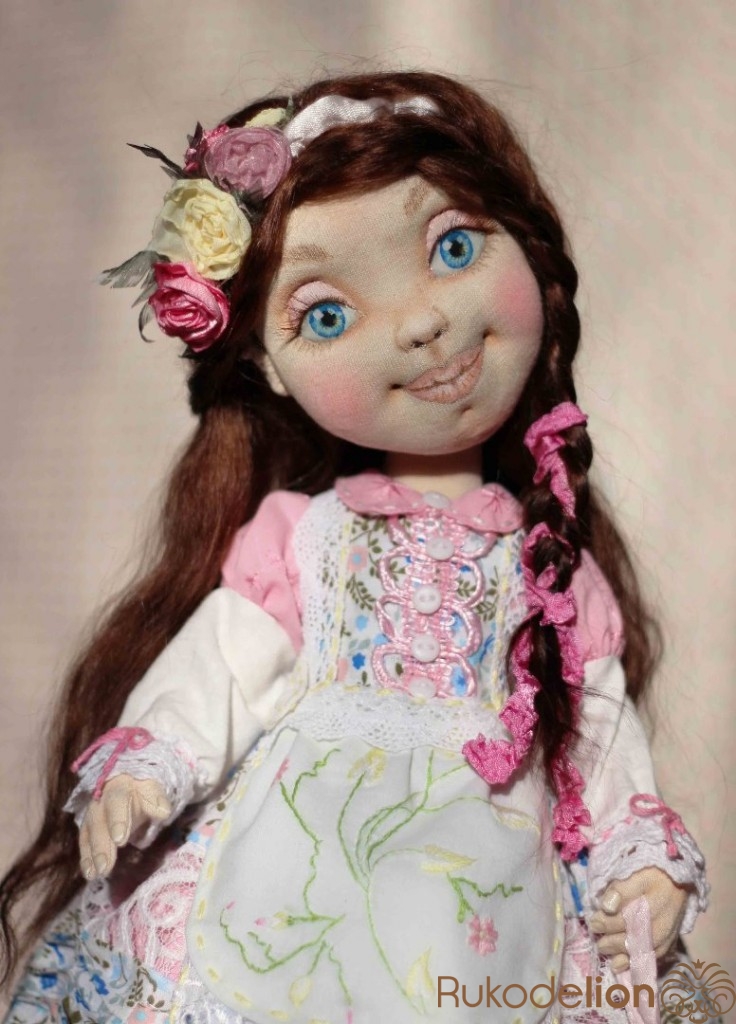 Ладушка - авторская текстильная куколка, сшита из, снаружи обтянута трикотажем. Личико тонировано сухой пастелью и расписано акриловыми красками по ткани, глаза имеют натуральный блеск. Голова поворачивается и наклоняется. Тело куколки также тонировано сухой пастелью. Волосы - мягкие локоны козочки, легко расчесываются, прическу можно менять.