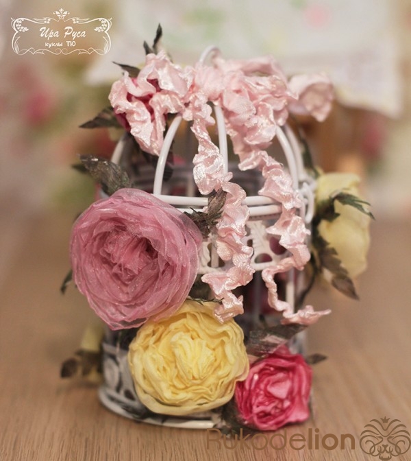 Повязка на голову и клеточка для птиц украшена цветами, так же изготовленными мной вручную.