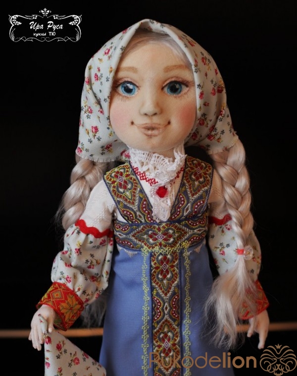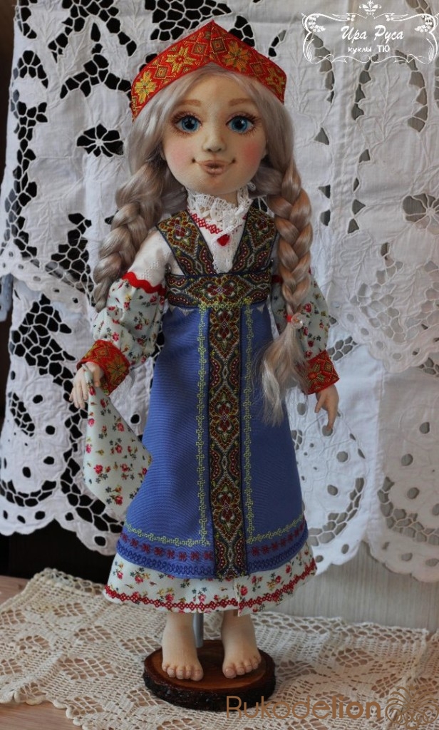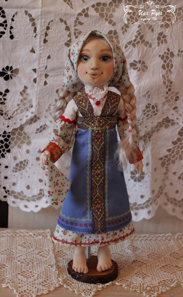 Настенька - текстильная кукла, головушка поворачивается, ручки на пластиковых суставах, внутри каркас, сгибается и фиксируется в разных положениях. Ножки в бедре и коленке на деревянных шарнирах, сгибаются, кукла сидит самостоятельно, а стоит только на подставке, которая входит в комплект.