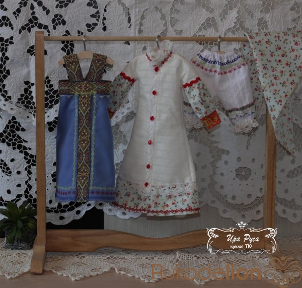 Одежда в славянском стиле, сшита из натуральных материалов, состоит из панталон, платья и сарафана. так же к образу прилагается кокошник и платочек.