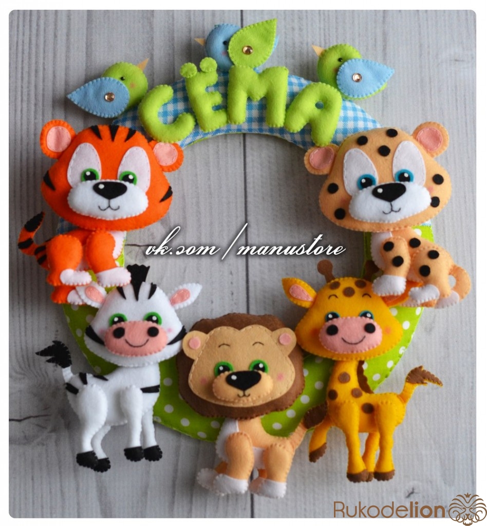 Как это ни странно, но на мое увлечение фетром повлияли именно мои занятия английским языком с малышами. Я часто прошу их принести на занятия какие-нибудь мелкие игрушечки, которые мы могли бы использовать во время урока. Но не всегда ребята помнят мои такие просьбы. И я подумала, что мне нужно самой иметь какие-нибудь интересные фигурки, которые я могла бы применить на занятиях. Я стала искать в интернете какие-нибудь пальчиковые театры, и в итоге нашла изделия из фетра. Правда, больше меня заинтересовали не игрушки для уроков, а именные панно на стену. Мне дико захотелось сшить что-то эдакое, тем более рукодельем я занималась всю жизнь, начиная с бисероплетения и заканчивая вышивкой крестиком по фото. Я показала пару фотографий фетровых изделий своему молодому человеку, а в ответ услышала, что такоооооое я уж точно не смогу сделать. Это лишь больше меня раззадорило и уже на следующий день я стояла в магазине в очереди за фетром, а вечером уже сшивала детали зебры, жирафа и т.д. Так на свет появились мои первые именные панно!
