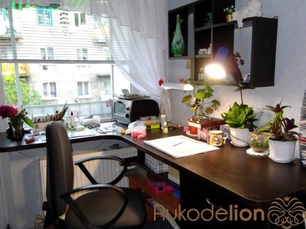 Отдельной творческой студии у меня нет. Сначала я организовала себе маленький творческий уголок, но сейчас уже он разросся практически на половину комнаты. Я здесь не только леплю, но и снимаю мастер-классы, фотографирую готовые изделия, поэтому стараюсь создать для себя просторное рабочее место, чтобы удобно было и работать, и хранить все материалы и инструменты.