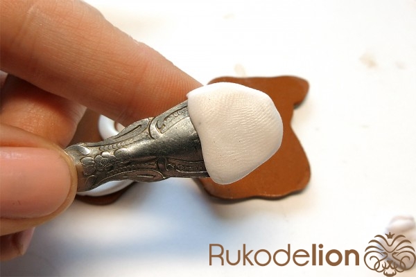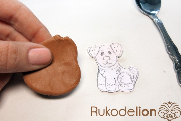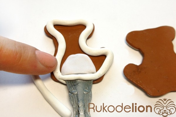Приложите рукоятку ложки к заготовке в районе лап собачки. При этом белая колбаска на заготовке должна располагаться чуть ниже той глины, которой облеплена рукоятка. Затем сделайте короткую нетолстую белую колбаску и прилепите ее сверху рукоятки также по нижнему контуру глины, которой облеплена рукоятка.