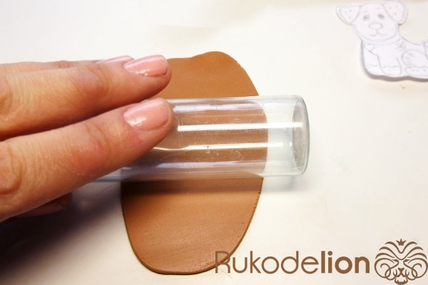 Нарисуйте на бумаге шаблон собачки желаемого размера. Затем разомните полимерную глину светло-коричневого цвета, придайте ей форму лепешки.