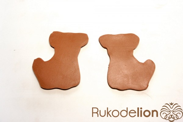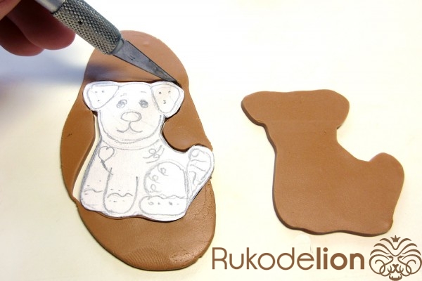 Положите сверху на пласт шаблон собачки и острым ножом обрежьте глину по краю шаблона. Соберите образки, снова их сомните и раскатайте в еще один пласт такой же толщины. Из этого пласта вырежьте вторую собачку.
