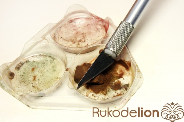 Возьмите темно-коричневую сухую художественную пастель и натрите ее ножом, чтобы получился мелкий порошок.