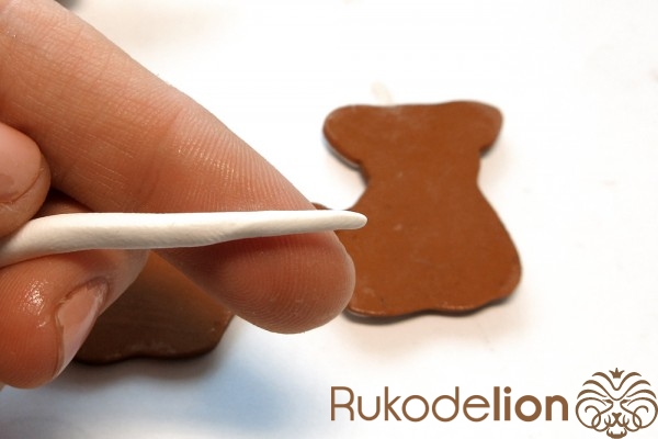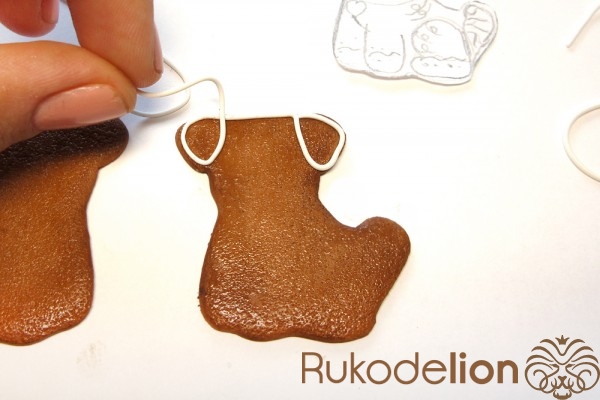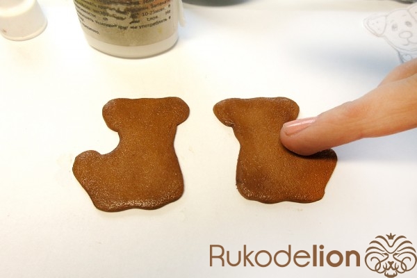 Из этих колбасок нужно выложить на поверхности одной заготовки рисунок, согласно шаблону. Начать выкладывать узор можно с ушек и головы собачки. Чтобы было удобно прилеплять колбаски, используйте любой подходящий стек или зубочистку. Во время работы старайтесь лишний раз не касаться поверхности заготовок, так как они пачкаются из-за слоя жидкой глины.