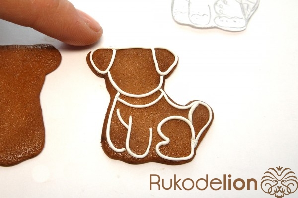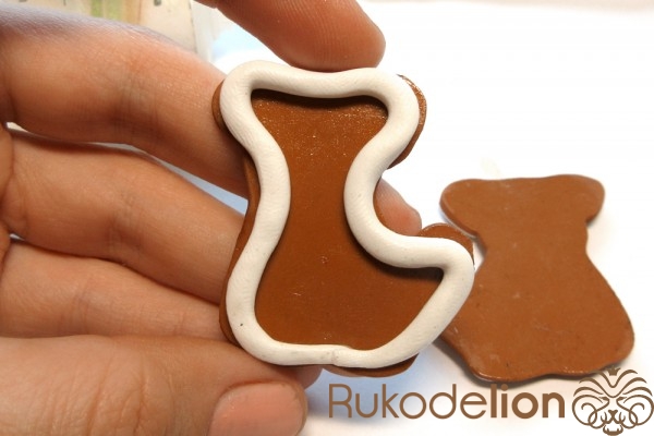 Теперь нужно прилепить колбаску к внутренней стороне заготовки по ее контуру. Начните прилеплять колбаску с ее узкого конца в нижней части заготовки там, где у собачки лапы. Далее прилепляйте по контуру, лишнюю длину обрежьте и состыкуйте концы колбаски.
