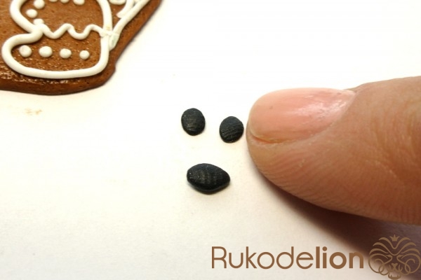Теперь из черной глины сформируйте носик и два овальных глаза.