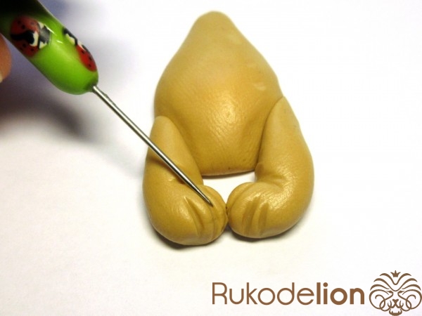 Прилепите лапы узкими концами к нижней части туловища (по его боковым сторонам). Иголочкой сделайте по три бороздки по краям лап, чтобы было похоже на ступню с пальцами.