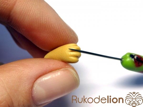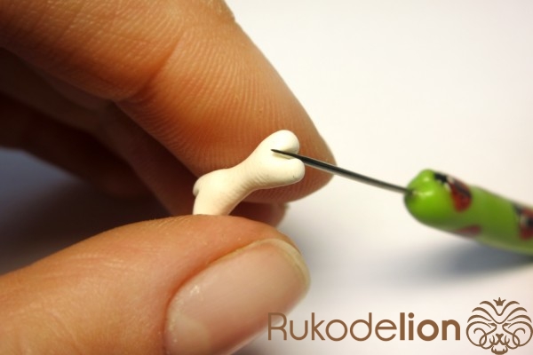Затем немного сплюсните концы косточки и на каждом конце сделайте углубление иглой, чтобы они стали немного раздвоенные.