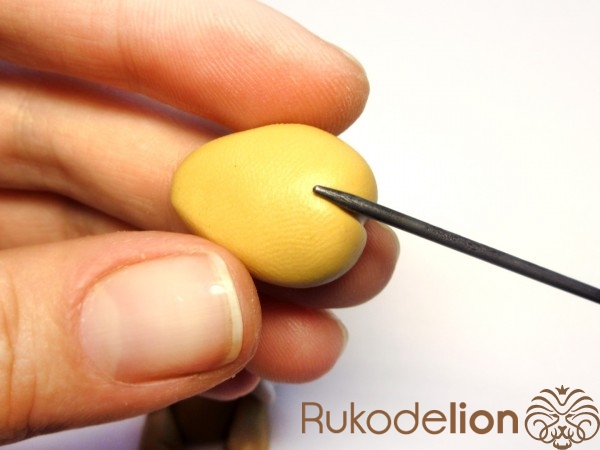 На широкой части головы толстой иглой сделайте небольшое вертикальное углубление, это будет мордочка.
